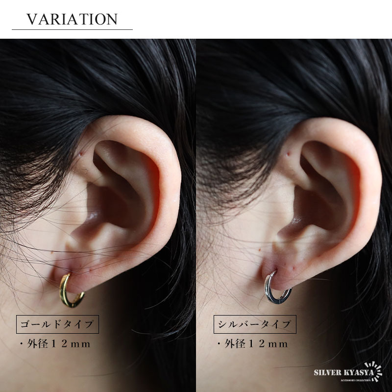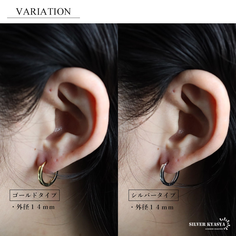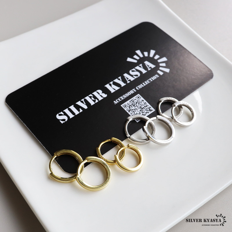 側面がフラットなフォルムのシンプルフープピアス。つやっとしたメタルな質感が魅力的なアイテム。カラー、サイズの全4タイプからお選びいただけます。
