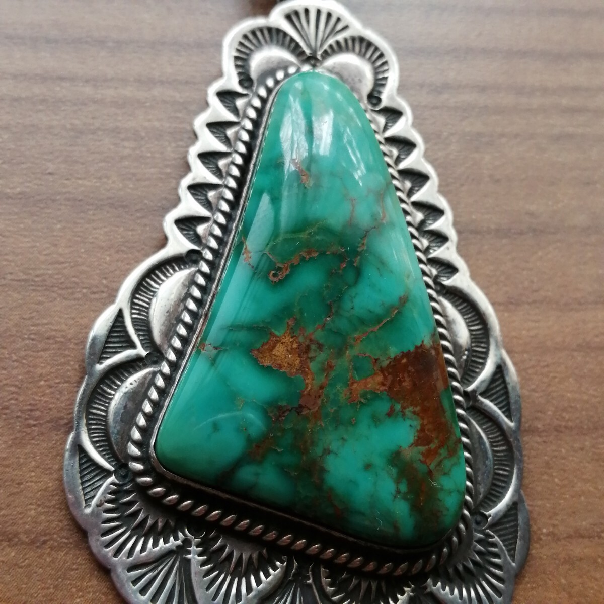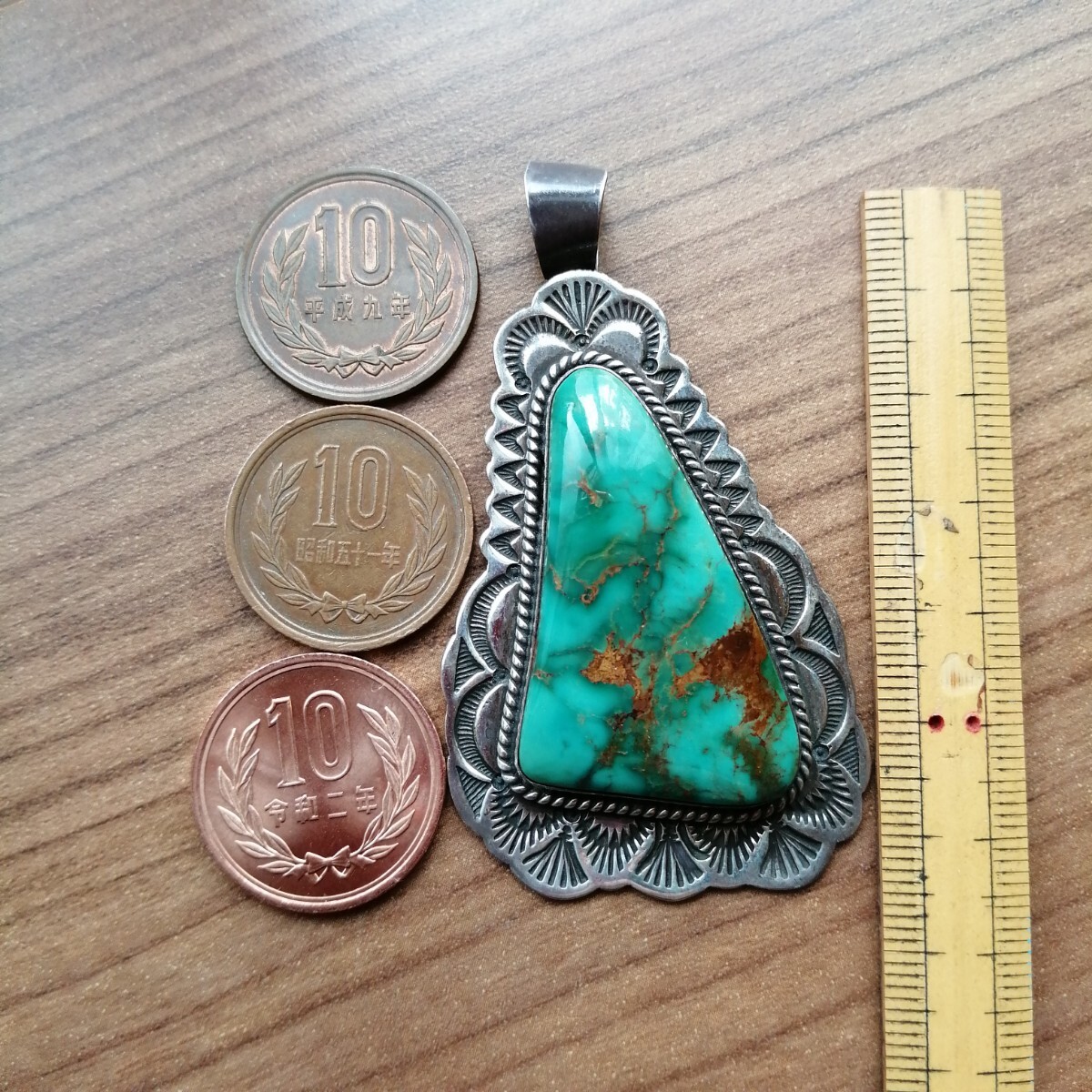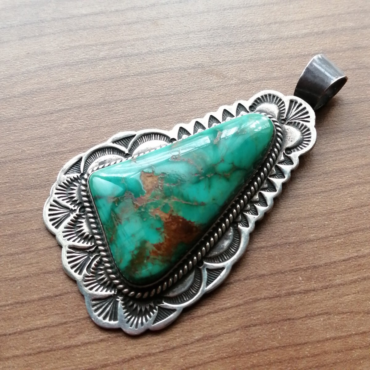 後ろに作者のネームの刻印とスタンプ入りで、このデザインが入ってるタイプのシリーズはターコイズの質が良い物を使ってあることが多くこちらのペンダントも光沢感と艶のある大変綺麗なターコイズがセットしてあります。