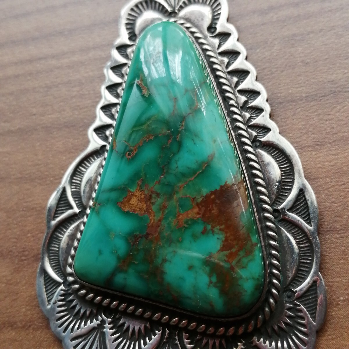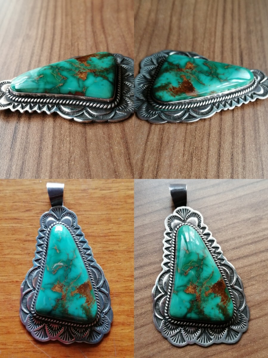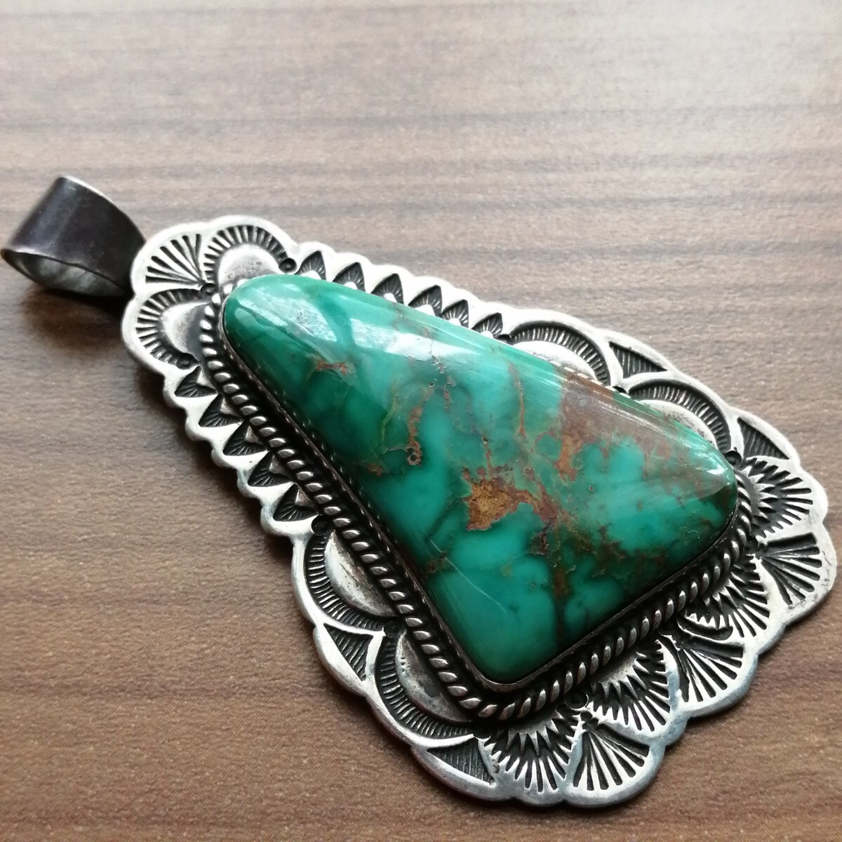 後ろに作者のネームの刻印とスタンプ入りで、このデザインが入ってるタイプのシリーズはターコイズの質が良い物を使ってあることが多くこちらのペンダントも光沢感と艶のある大変綺麗なターコイズがセットしてあります。