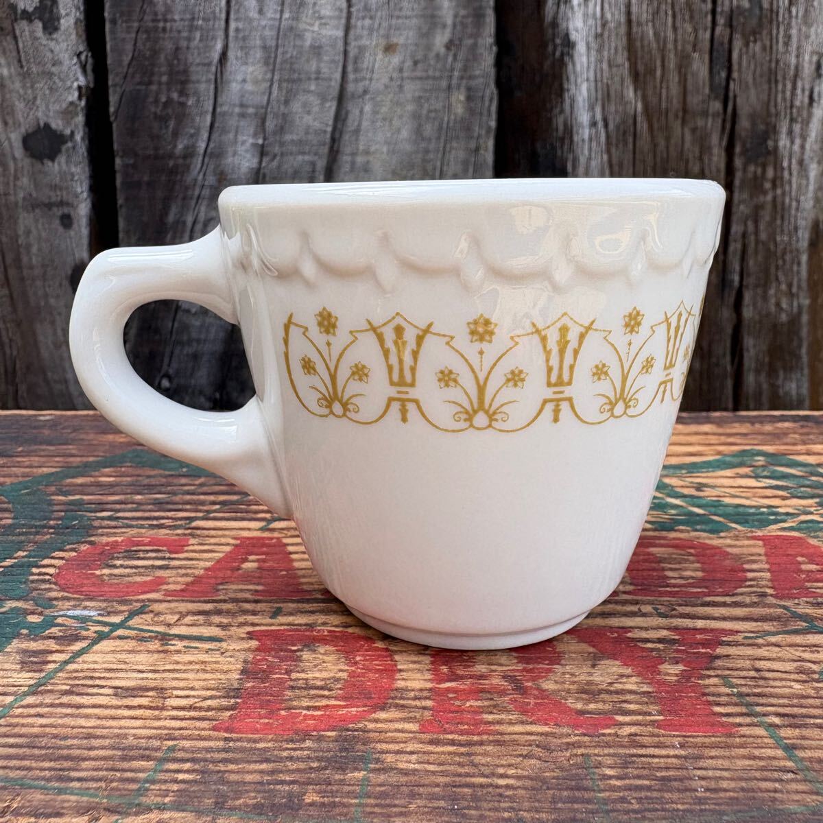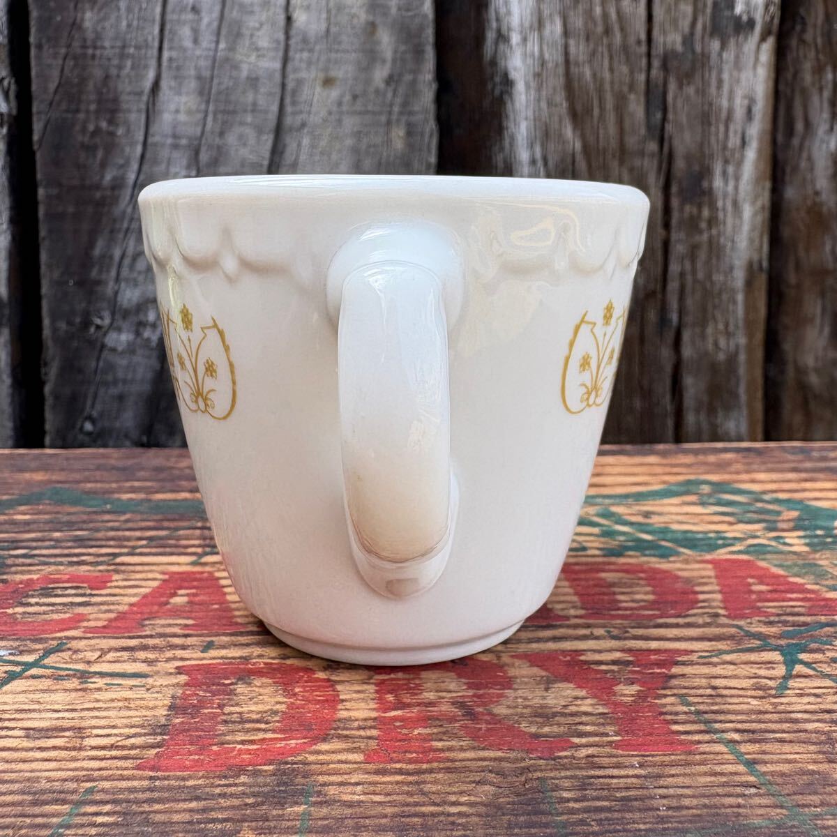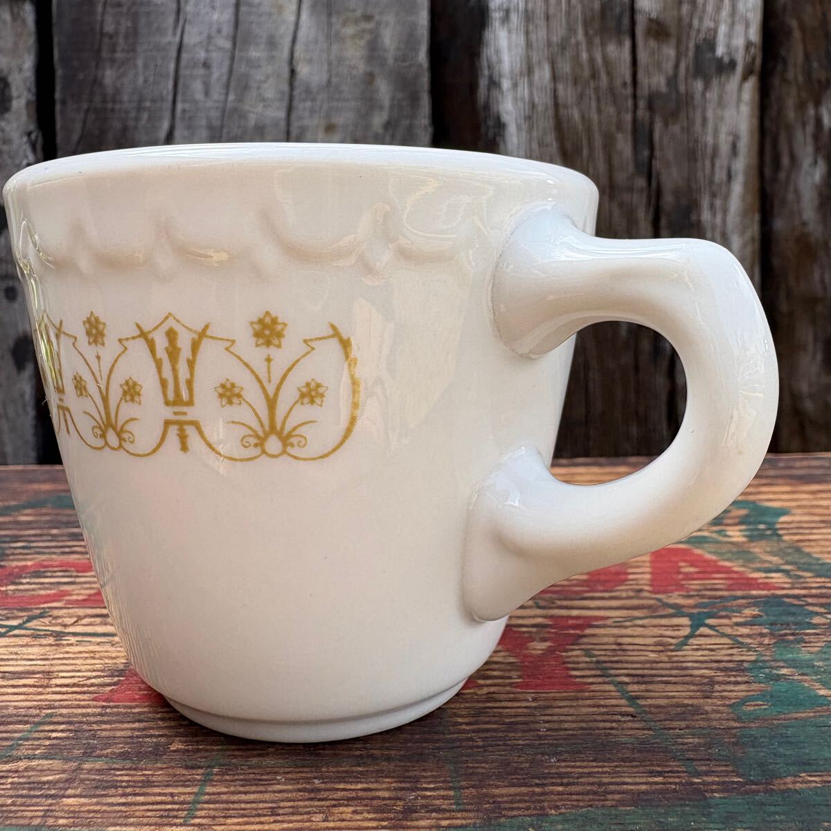 マグの周囲に金色のディテールが施されており
