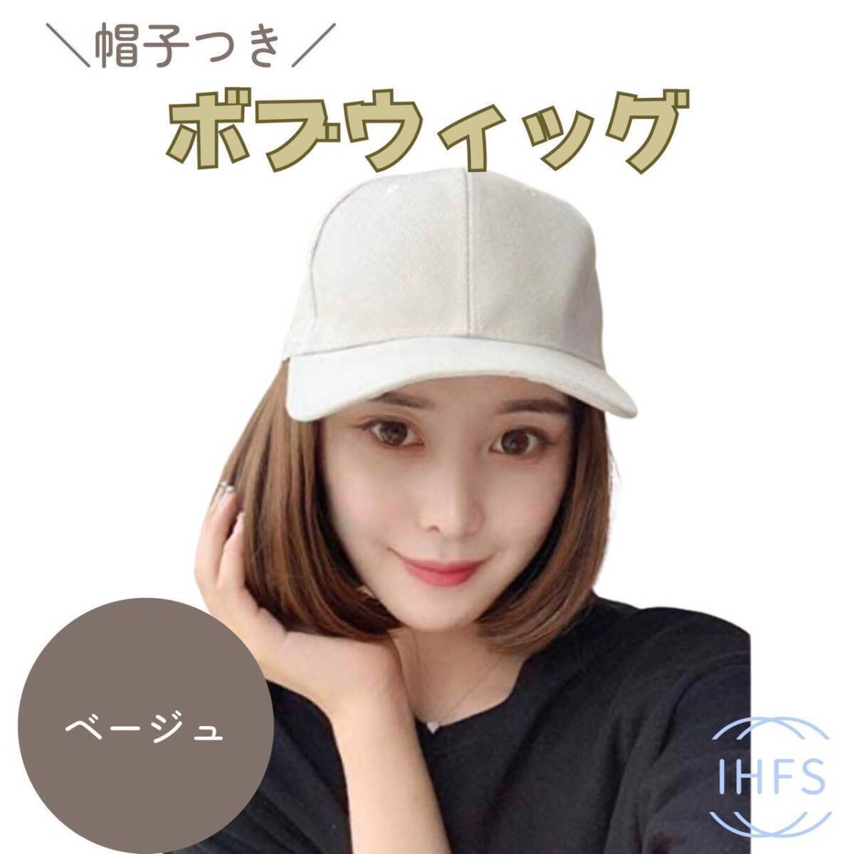 【軽やかなショートボブスタイル】帽子付きウイッグから見える髪型は、身に着けるひとを選ばない内巻きボブ風スタイル。サイドからの印象も重たくひきずらない軽い雰囲気です。さっと身に着けてすぐにキマります。