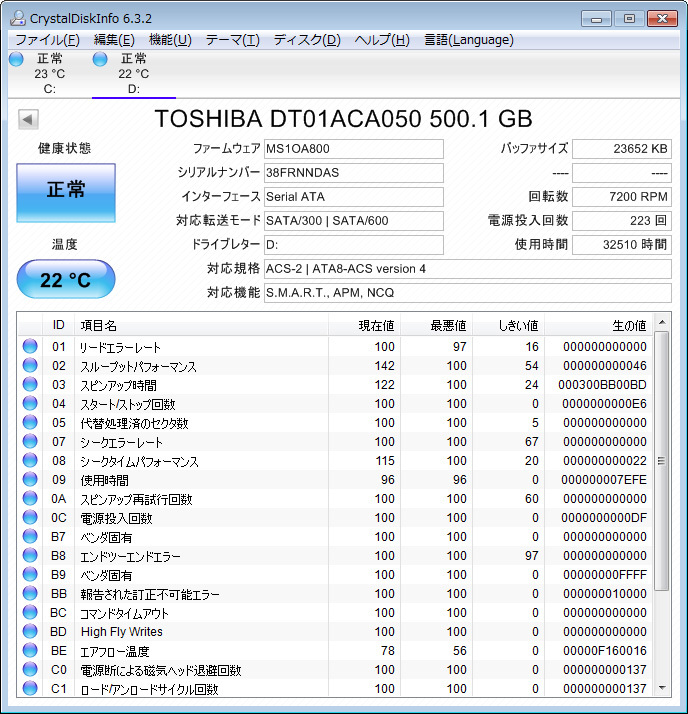 どちらにも不良セクタの表示は何もありません。動作は問題なく、良品と思います(^o^)