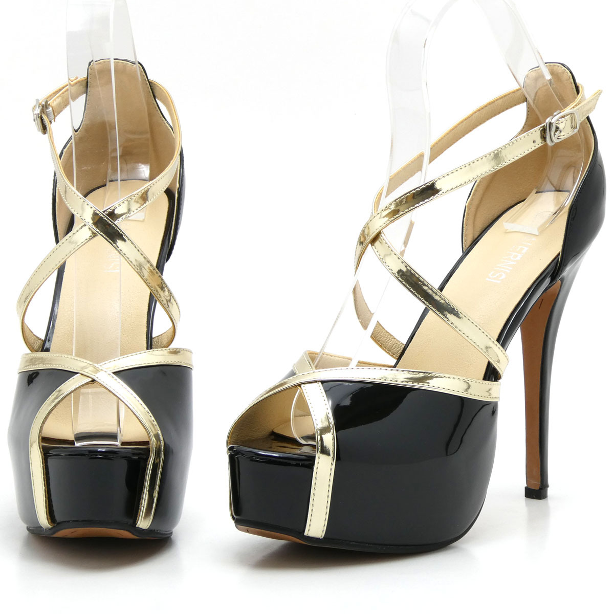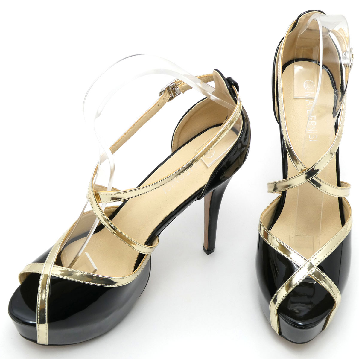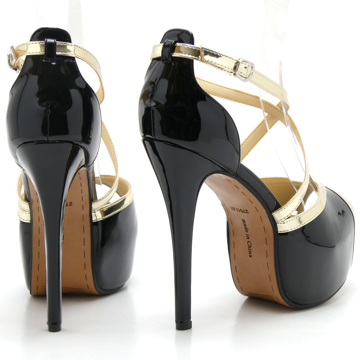 新品 大きいサイズ パンプス ブラック 27.5cm 131502-45 エナメル調 オープントゥ クロスストラップ 前厚底ストーム ハイヒール