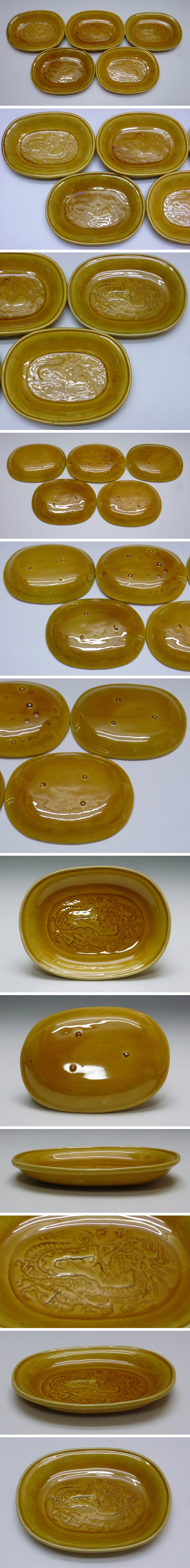 ★※★※民平焼 黄釉 印刻雲龍文 小判形皿 五客 旧家 初心だし★※★※