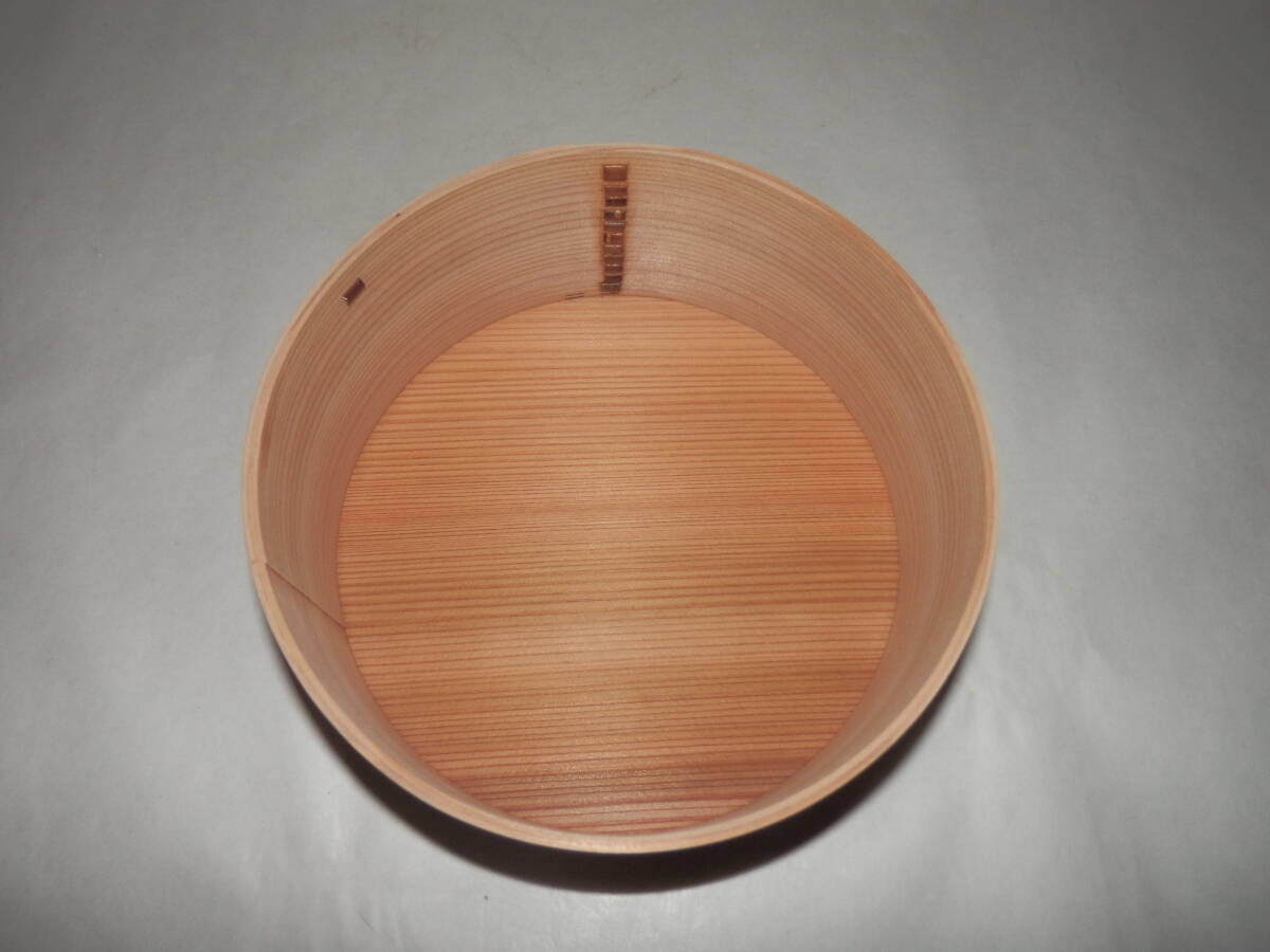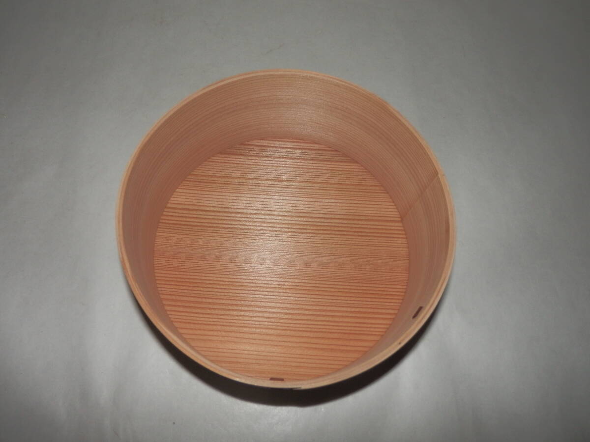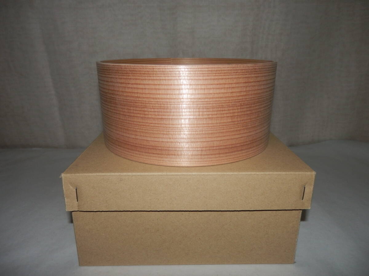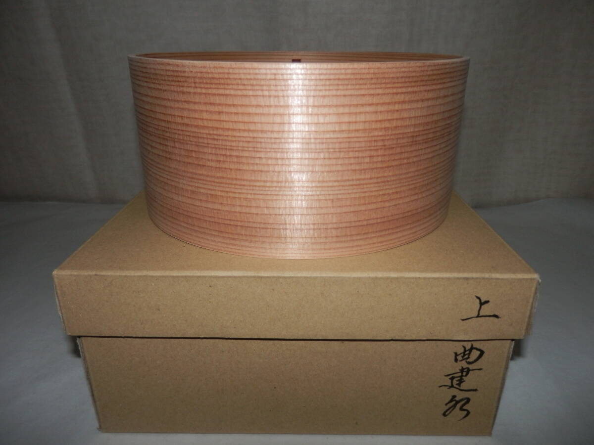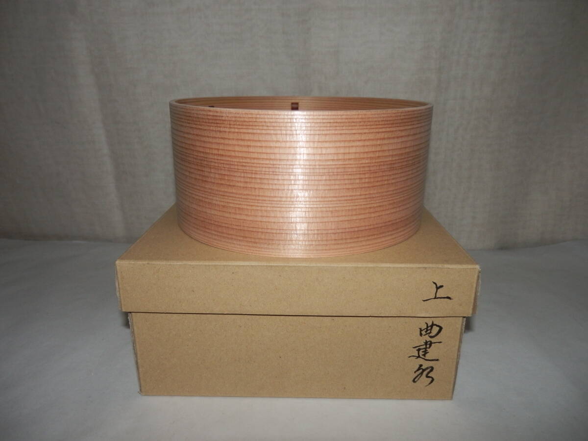 「新品・茶道具」秋田杉製の曲建水です。{上}です。 径約16.8cm 高さ約7.6cm 紙箱。 どうぞ宜しく。 『現在水漏れは有りませんが長期に亘ると,木が締まり何時かは漏れが生じて参ります。出来る限り御使用の前日くらいに先ず中に水を入れさらに外も湿らして膨張させて御使用下さい。』