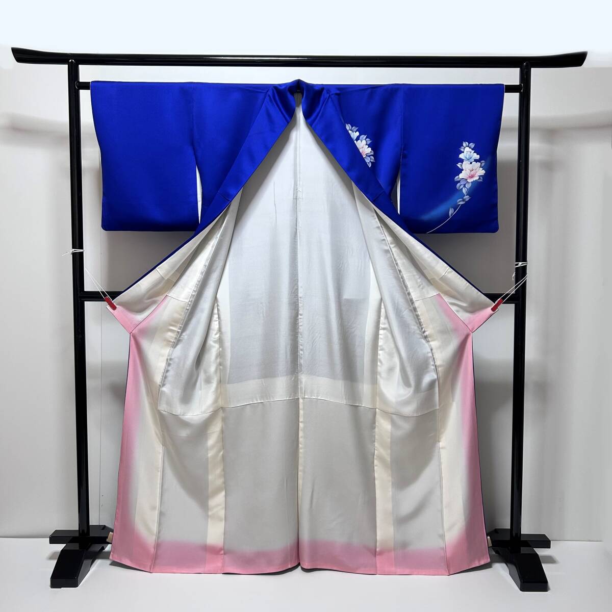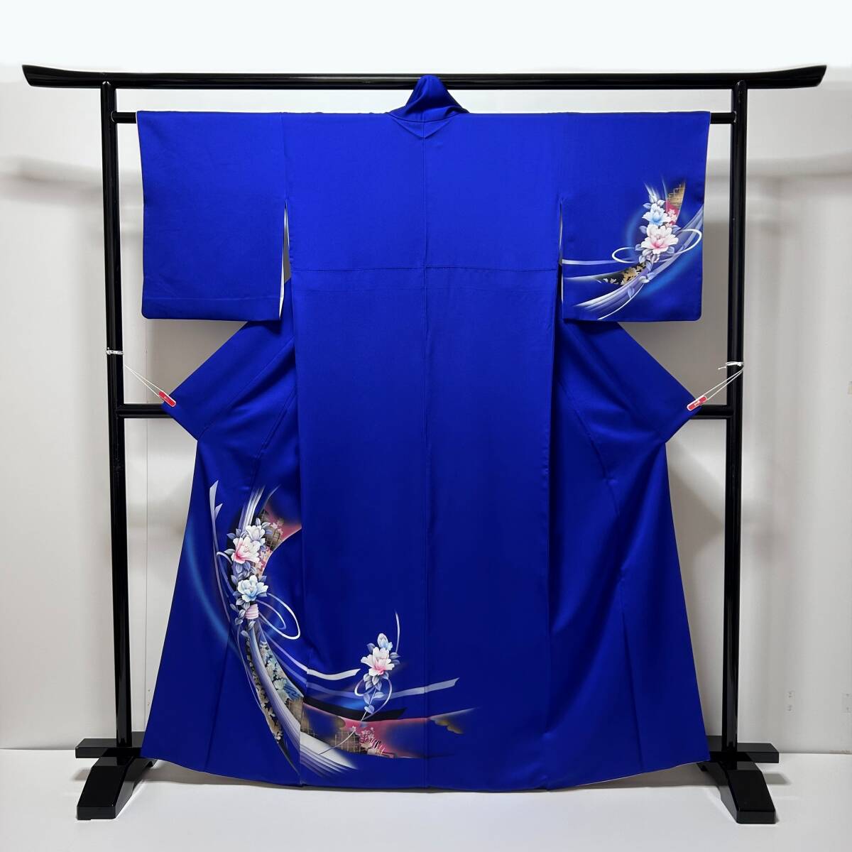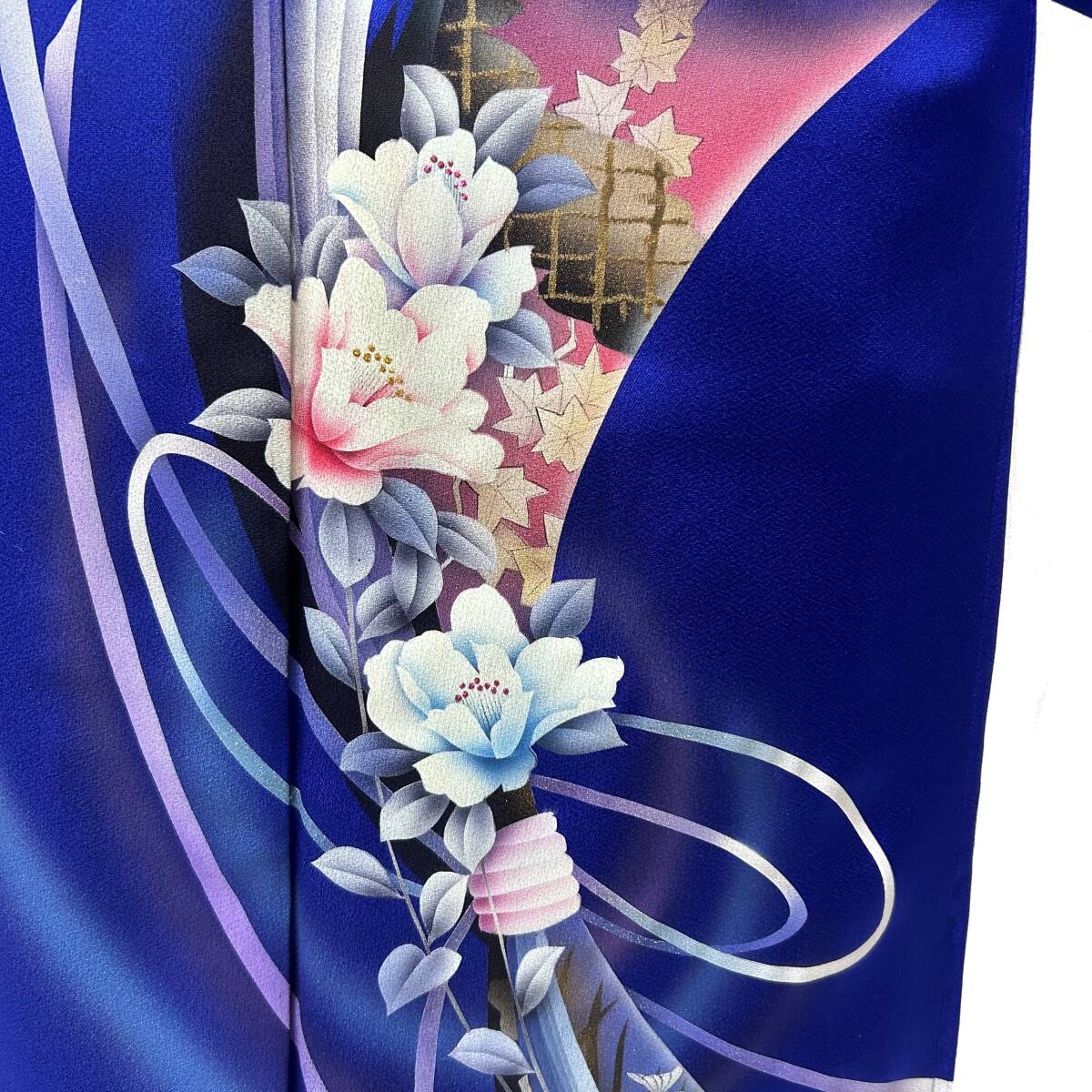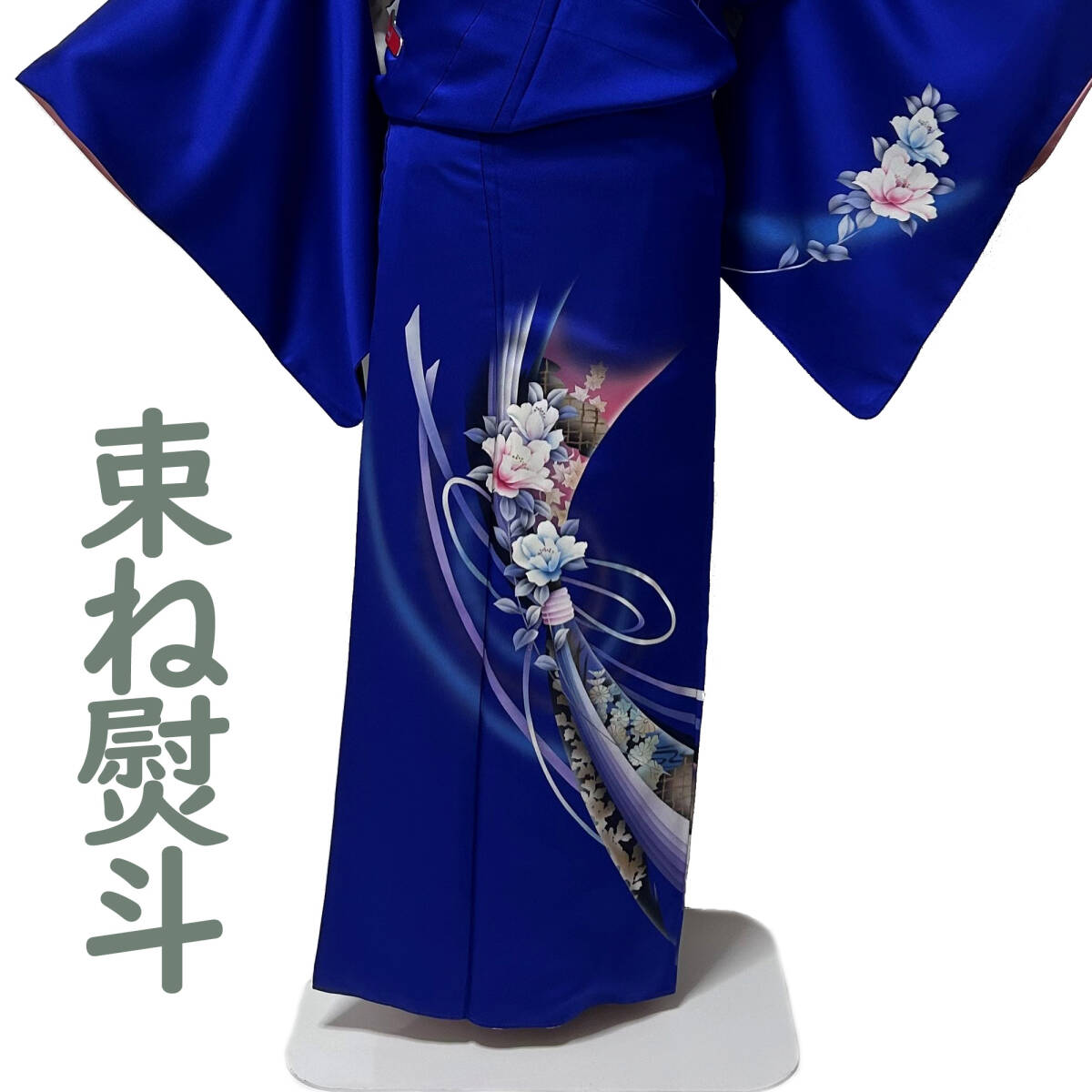 瑠璃色の地に、束ね熨斗に花が描かれた色鮮やかなお着物です。