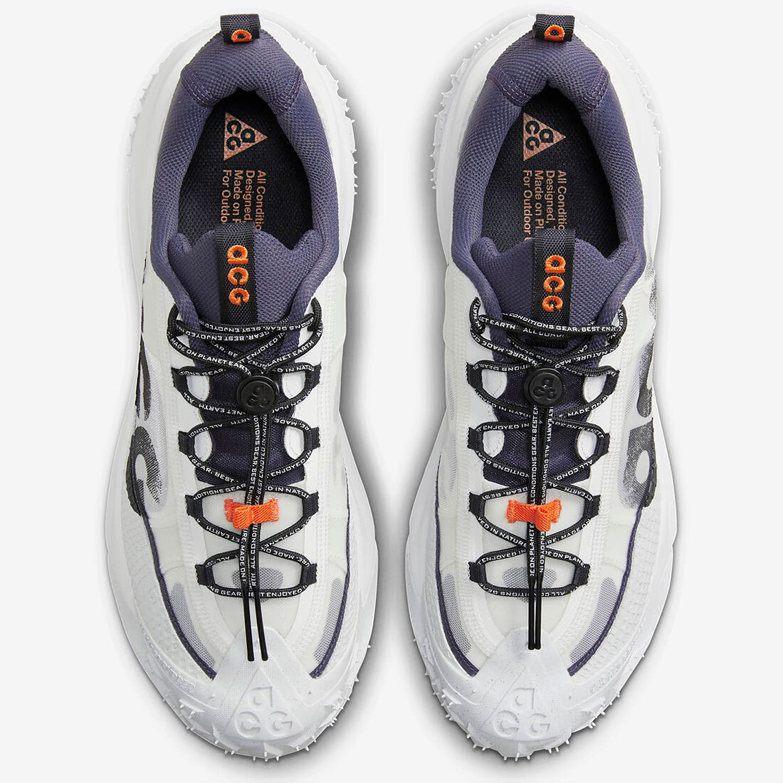 トレイルの鍵を握るのは、こだわりのディテールです。 アップデートされたACG マウンテン フライ 2はスピーディーに動ける丈夫なデザインで、どんな過酷な環境にも対応。頂上を目指すのに最適です。 氷のように滑る岩や木の根が縦横無尽に走るトレイルにも対応できるように、面積を広げたトゥキャップと耐久性の高いラバーのサイドウォールで補強しました。 通気性に優れたアッパーが熱を逃がし、濡れてもすぐに乾きやすく、激しく動き回っても心配ありません。