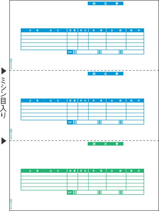 レーザープリンタ用帳票。A4サイズ3分割(納品書/納品書/請求書)。1箱500枚入り。ミシン目切り離し後のサイズ;99x210mm。紙厚:0.08mm坪量;64g/m2。