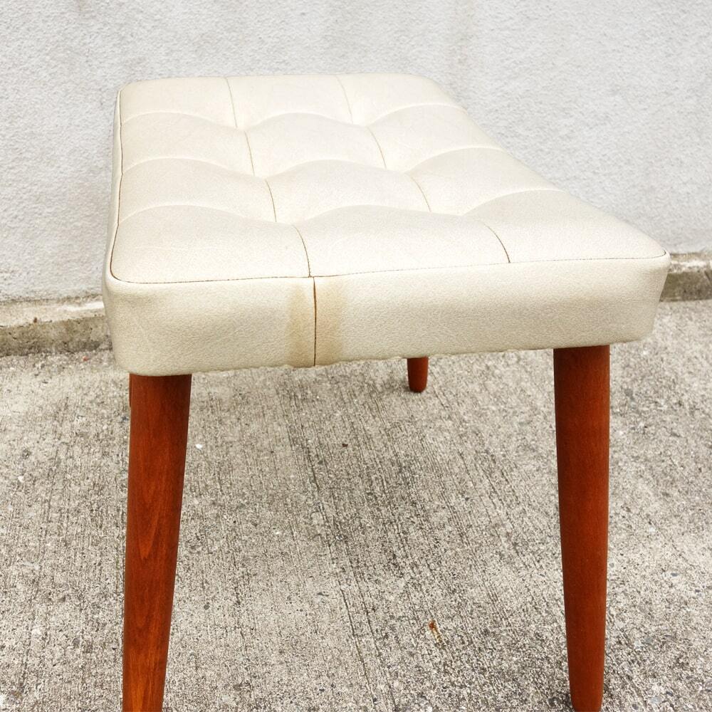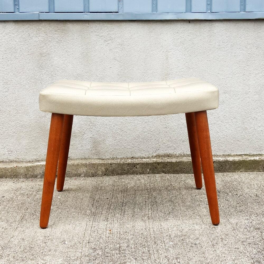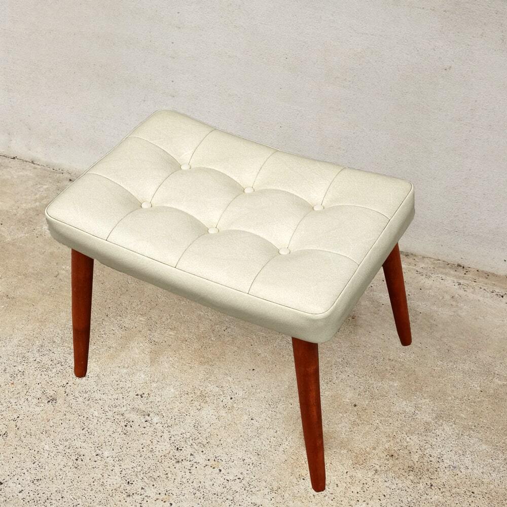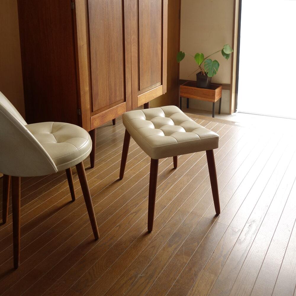 真っ白というよりもアイボリーっぽい色の合成皮革の座面に木製の脚が付いたミニスツール。