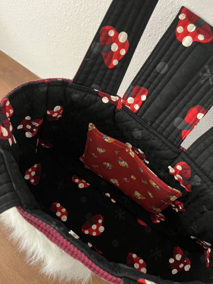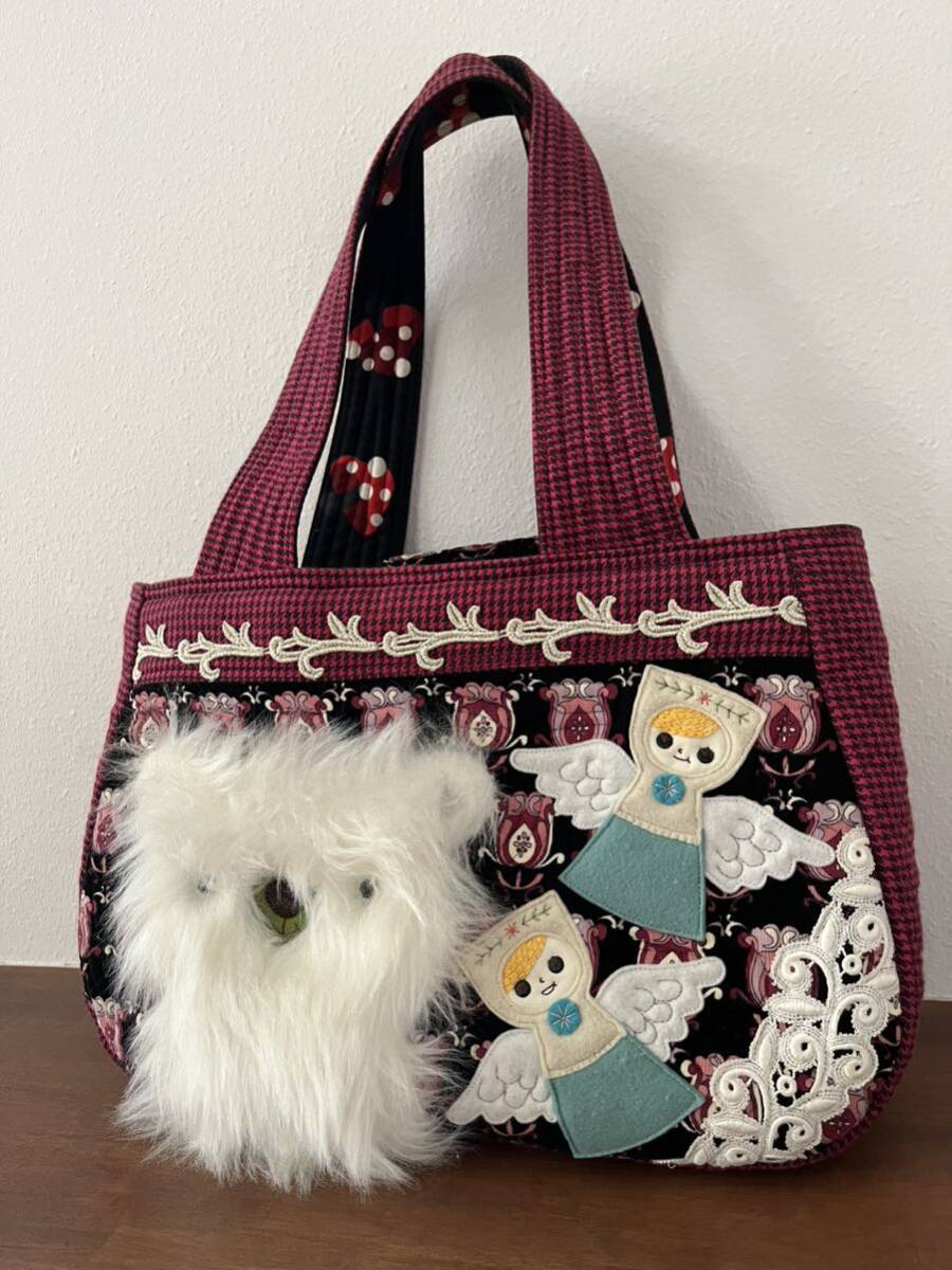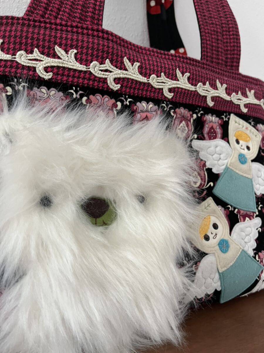 ハンドメイド作家 白熊と天使のキルティングバック 手作り アップリケ ファー
