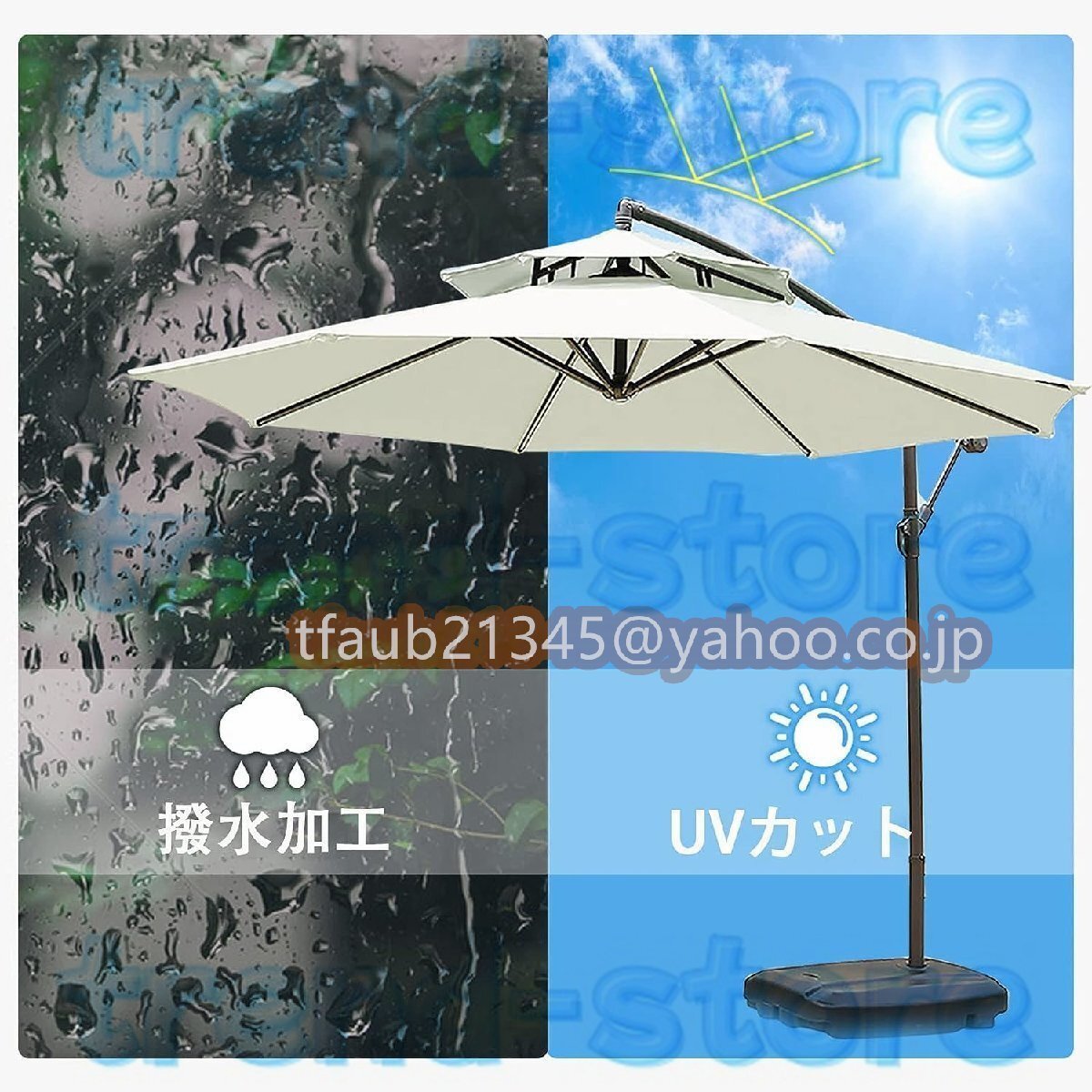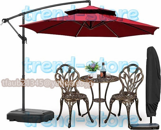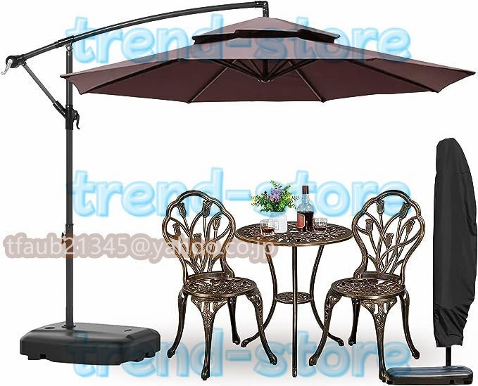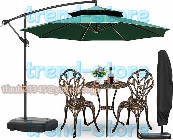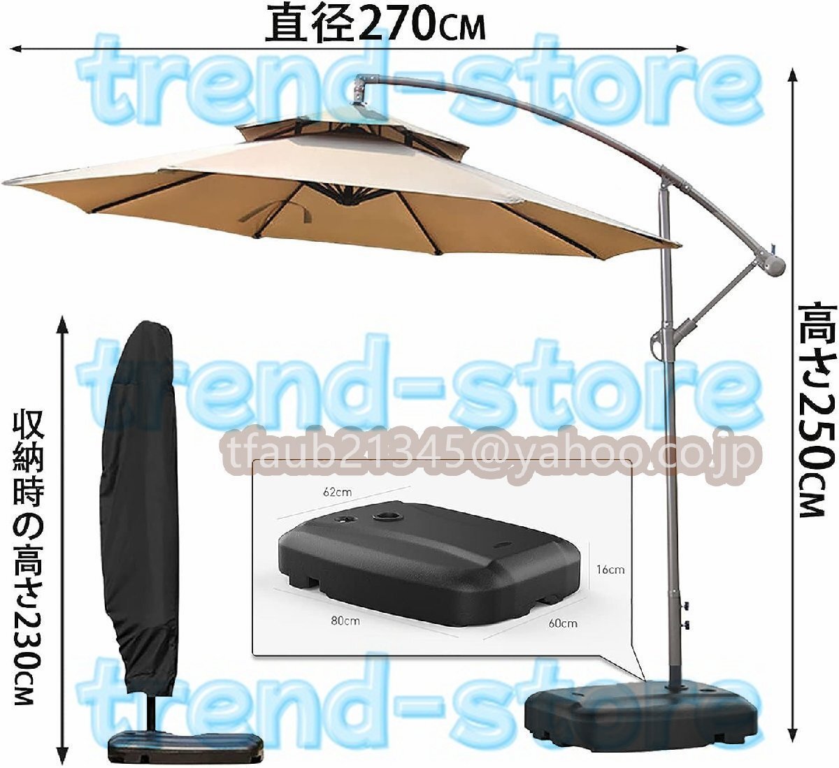 【270cmパラソルセット】: 大型ガーデンパラソルセットは、直径270cmのダブルトップパラソル、60kg水タンクベース、そしてパラソルカバーが含まれています。