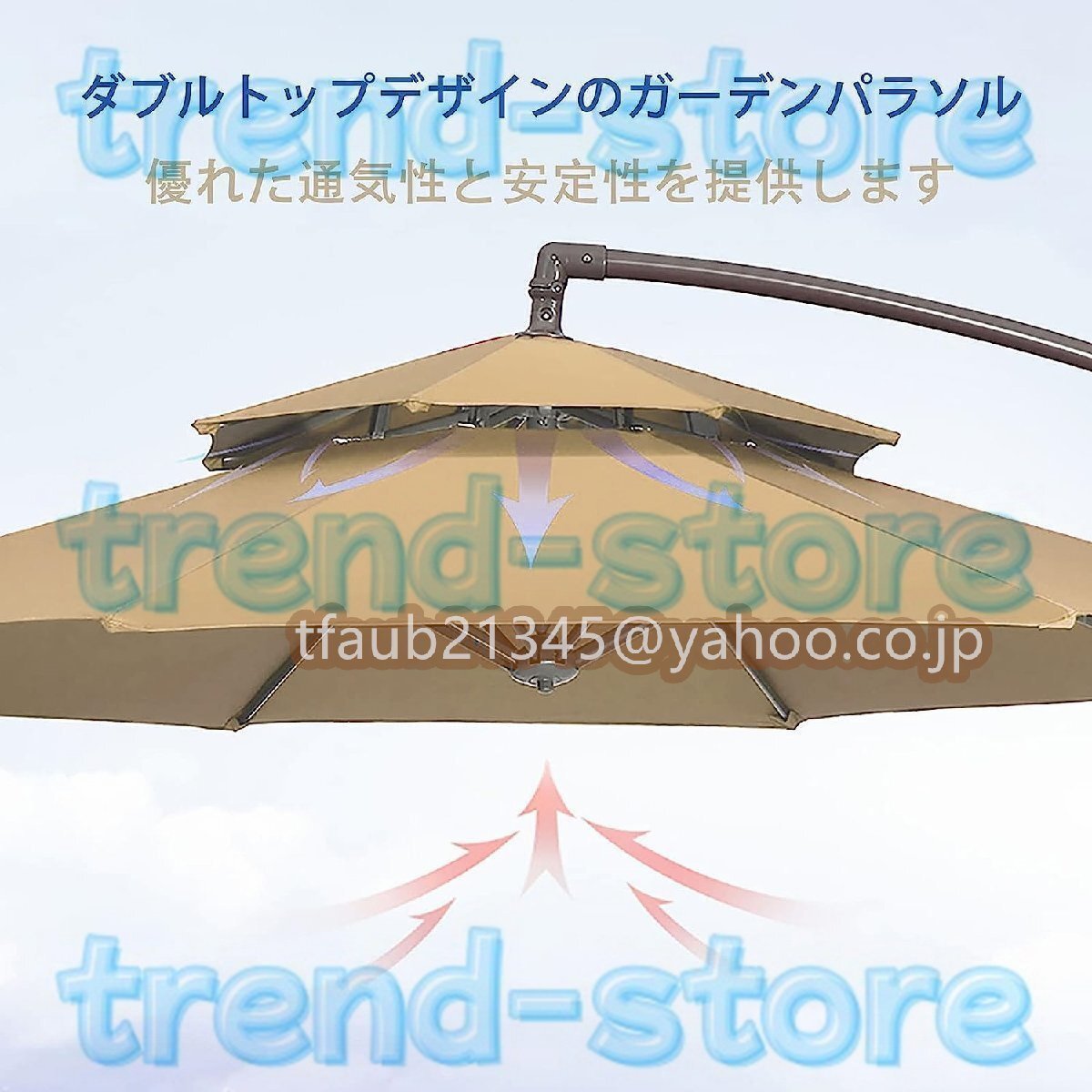 【ダブルトップデザイン】: 多数のエアベントを備えたダブルトップエアベントは、十分な空気の流れと熱の放出を可能にします。熱い空気や風は、多数のベントを通って素早く流れるため、パティオのパラソルを風の強い状況に対してより安定させ、下部が涼しくなります。