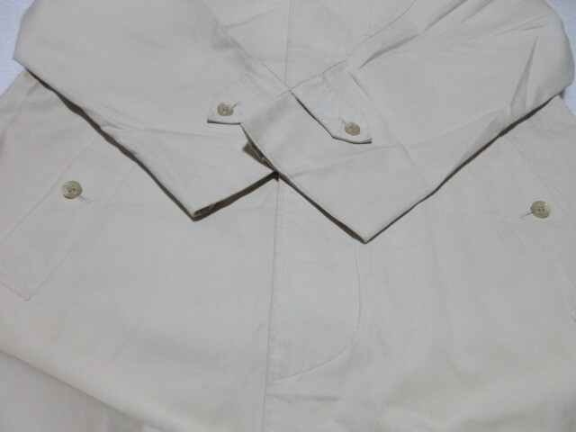 ディテール:襟=バルカラー、袖=ラグランスリーブ、カフストラップ付き、前立て=比翼(フライフロント)