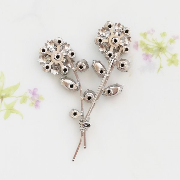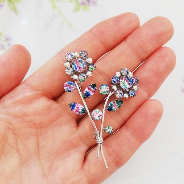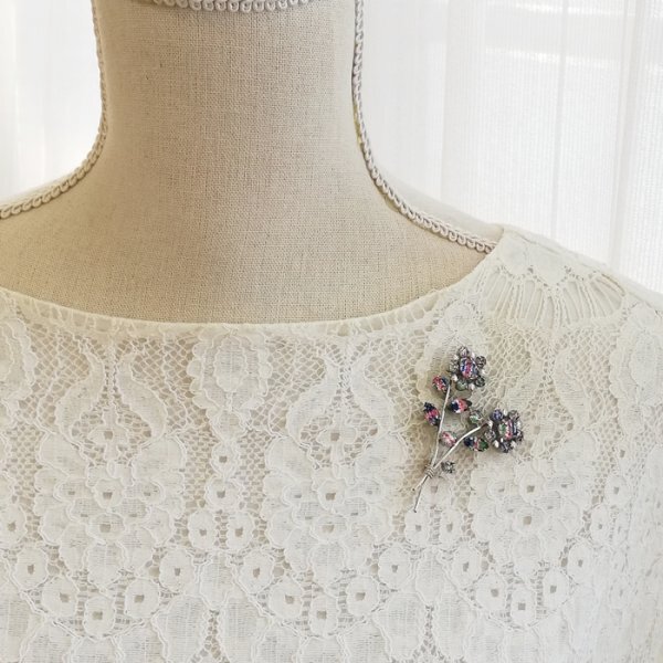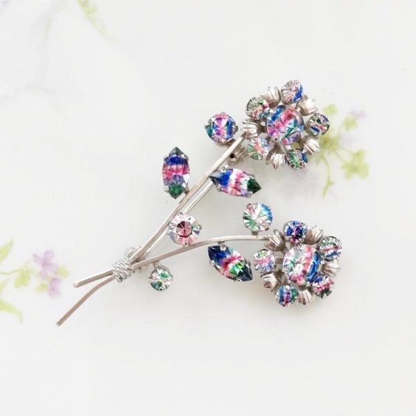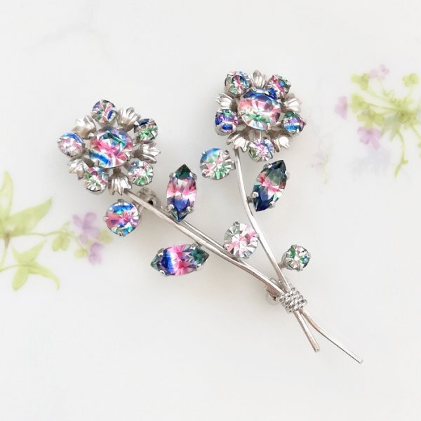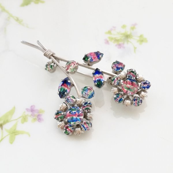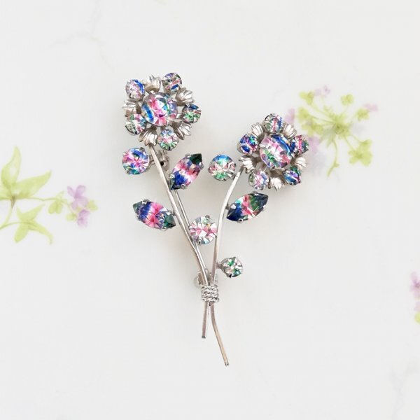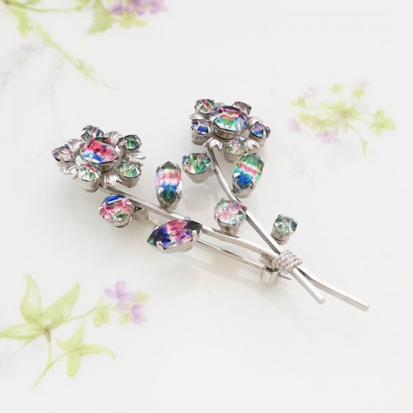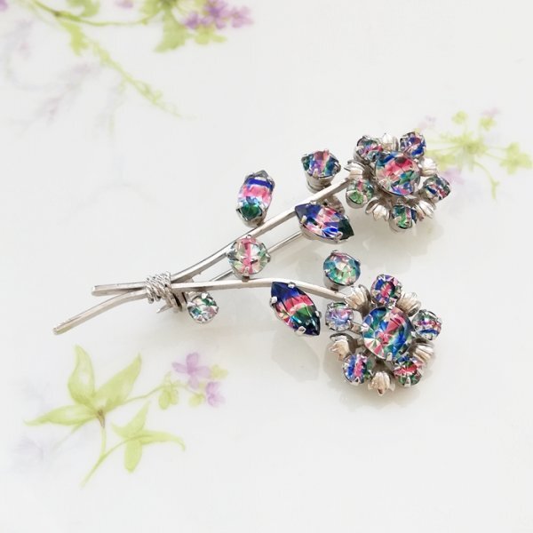 アイリスガラスのフラワーモチーフのブローチです。 虹色に輝くアイリスガラスがたっぷり並び、とても綺麗です。 お洋服以外にも帽子や鞄のアクセントにもどうぞ。 経年の為、金属部分に多少の小キズが見られます。 ■ブランド: Unsigned ■刻印: なし ■年代(推定): 1950-60年代頃 ■輸入国: イギリス ■サイズ: 約6.3cm x 約4cm ■重量: 約10g アンティーク・ヴィンテージ商品には、経年による傷や劣化などがあります。 目立つものはアイテムの詳細に記載しておりますが、説明以外にもキズや損傷などがある場合がございます。 古いものですので、ご理解いただける方のみご入札下さいませ。 他サイトでも販売しておりますので、同時にご注文があった場合は、品切れの場合もあります。その場合は、大変申し訳ございませんが、ご注文をキャンセルとさせて頂きます事をご了承くださいます様お願いいたします。 | |||