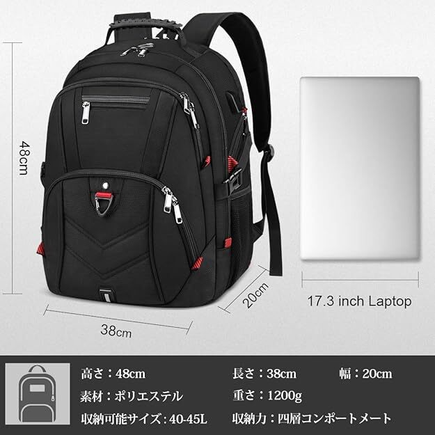 • 【ちょっといいデザイン!】商品仕様:高さ48cm×長さ38cm×幅20cm;重量:約1200g;カラー:ブラック、ブルー、赤;四層式大容量なリュックサックです。