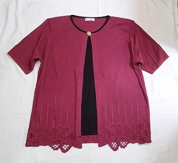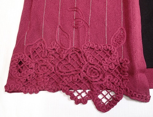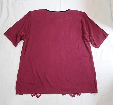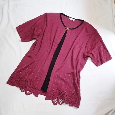 ◆Le Fannous/裾リボン刺繍入り デザイントップス 半袖ニット ゆったり/ボルドー
