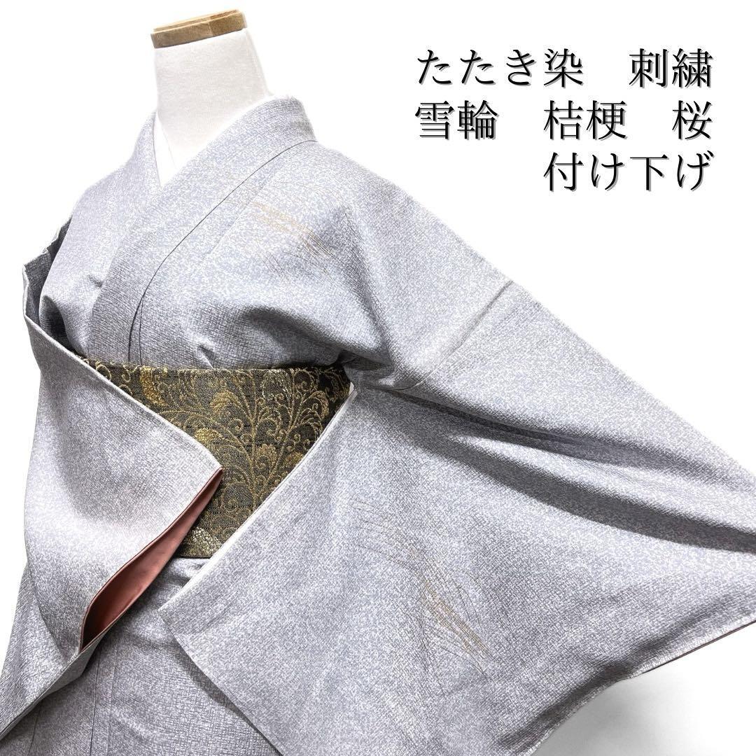 付け下げ たたき染め 雪輪 桔梗 桜 刺繍 金彩 波 露草 着物 065w d