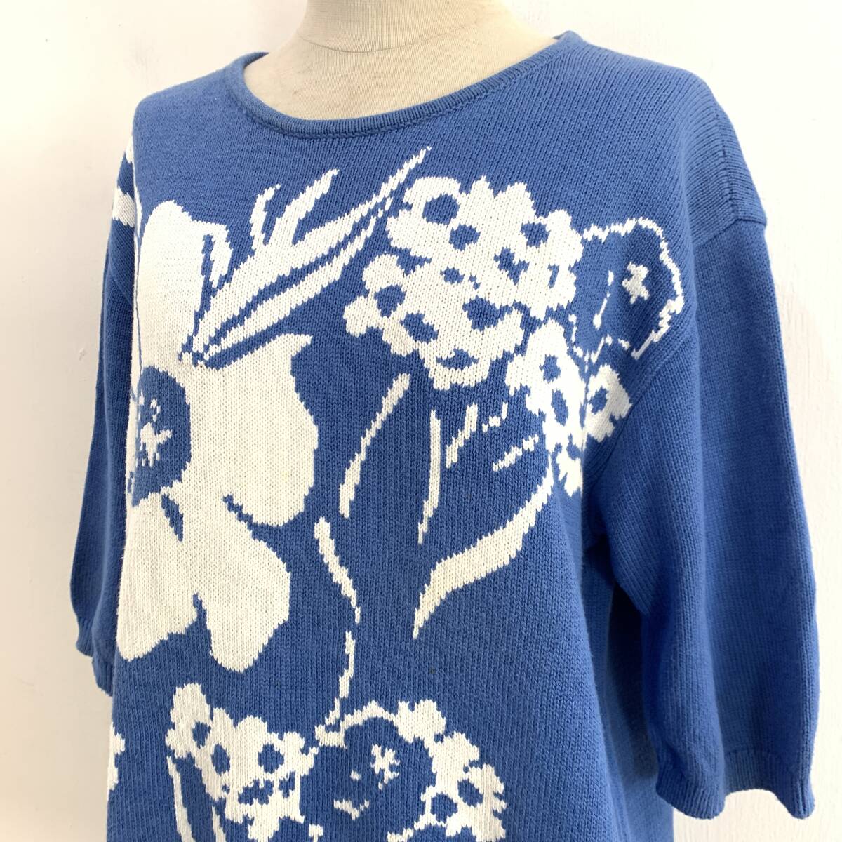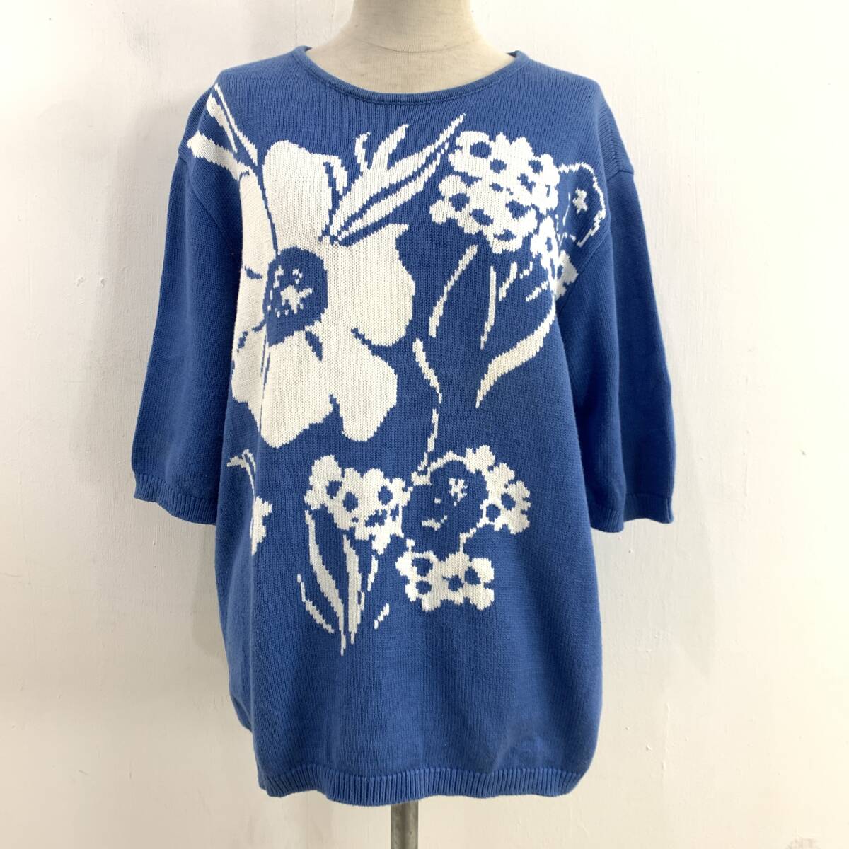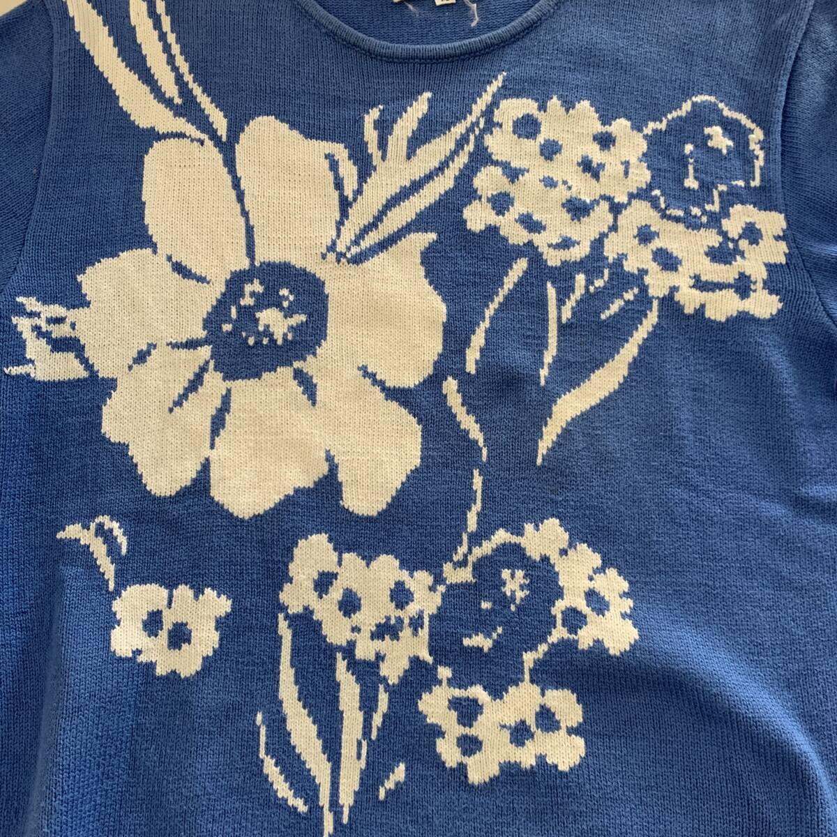 ☆HANAE MORI ハナエモリ 森英恵 Vintage 昭和レトロ 花柄 半端袖 コットンニット ブルー サイズM 綿100%【レターパックプラス郵送可】K