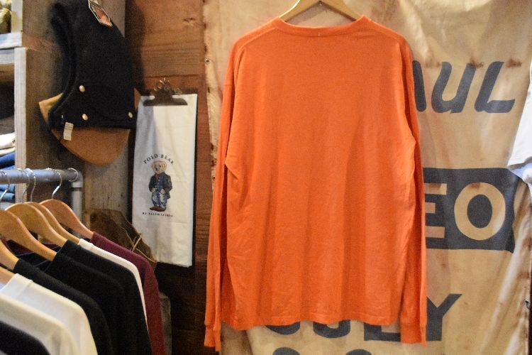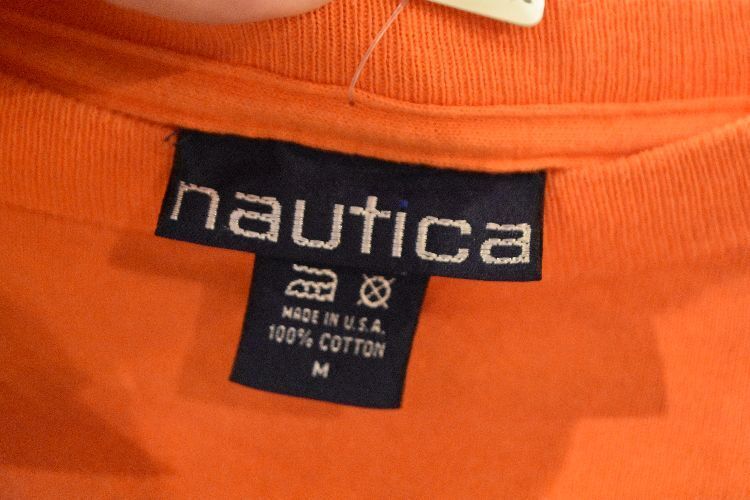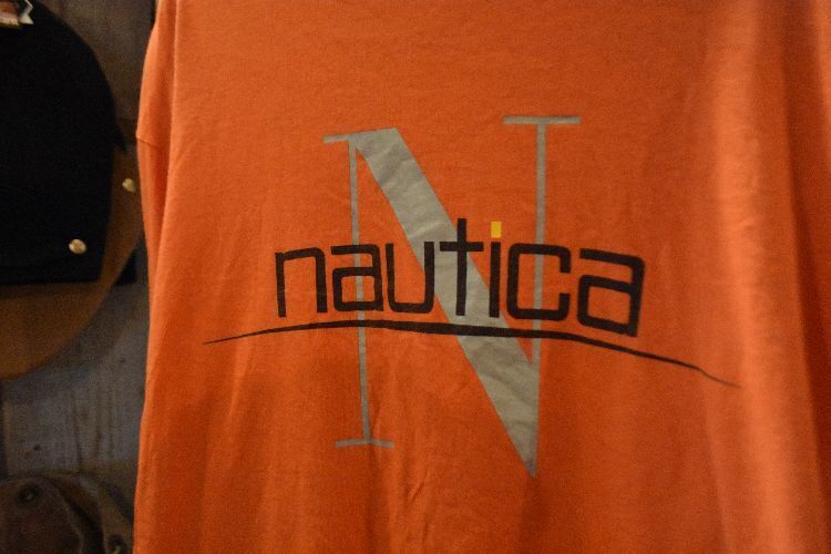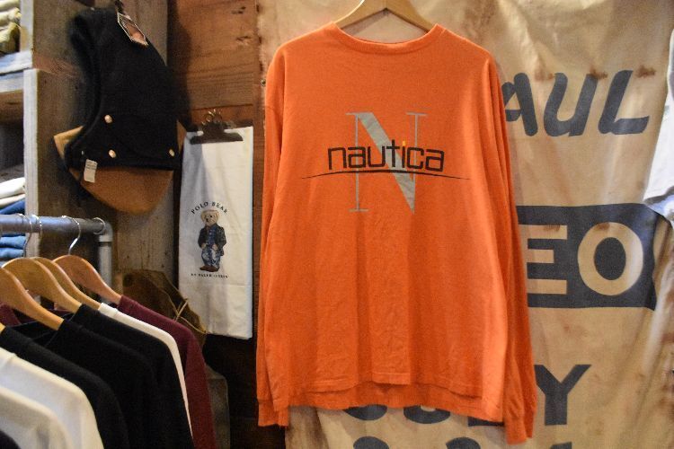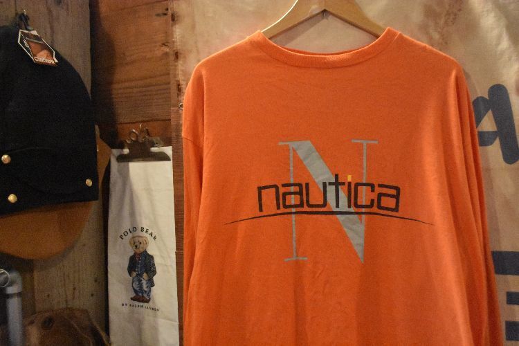 グッドカラー◎USA製90sビンテージNAUTICAノーティカ長袖ロゴプリントTシャツMオレンジ100綿ロンTアメリカ製アメカジストリートn23354