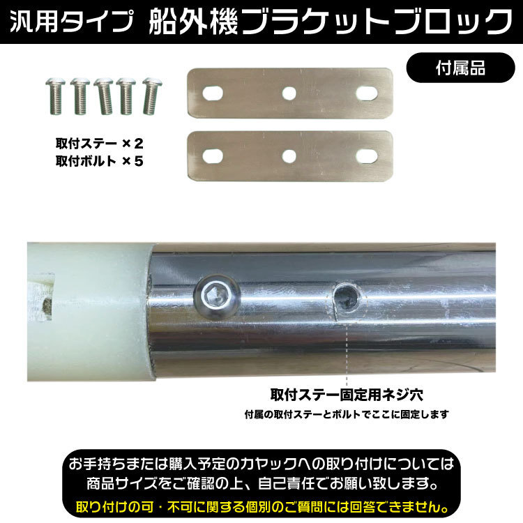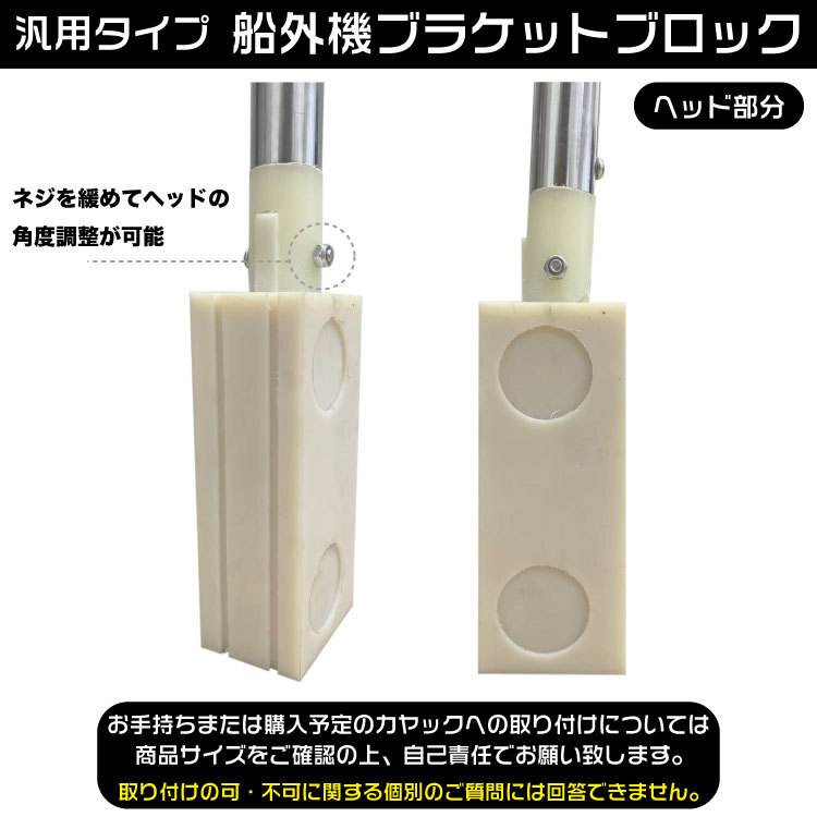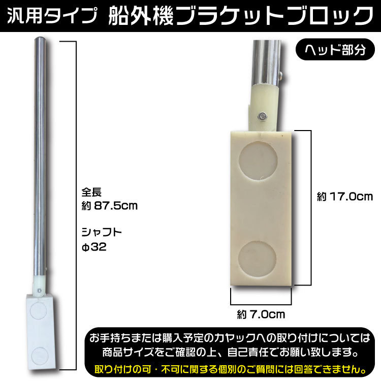エレキ・船外機 ブラケットブロック■ブランド:-■サイズ全長 :87.5cmシャフト :φ32ブロック :W17cm×H7cm■カラー :画像参照■付属品 :取付ステー×2・ビス×5●商品説明●カヤック用エレキ・船外機ブラケットです。先端のブロック部分に船外機を取り付けるタイプの商品になります。汎用品なのでサイズをご確認の上、お手持ちの船に装着可能かをご判断下さい。※取り付けの可・不可に関する個別のご質問には回答できません。