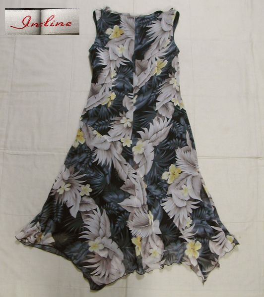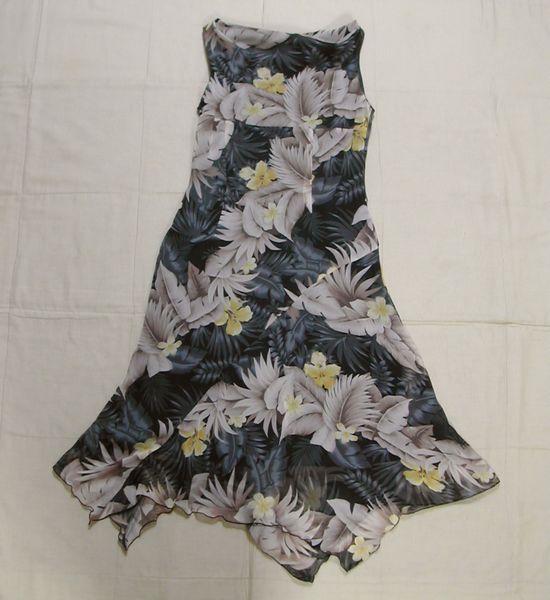 表地は薄手素材でグレーと茶系のリーフに黄色い花柄のワンピースです。