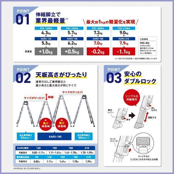 ![]() 業界最軽量の伸縮脚付専用脚立です 最大約1kgの軽量化を実現!! 通常のはしご兼用脚立と最小高さと最大高さが同じサイズで使いやすい シンプルな伸縮操作が可能な安心のダブルロック 安心の55mm幅広踏ざん採用 最大耐荷重100kg 【商品詳細】 型番:KARU-120 設置サイズ:幅46.4cm~51.8cmX奥行65.7cm~83.9cm 本体重量:5.3kg 段数(天板除く):2段 収納時サイズ:幅46.4cmX奥行16.2cmX高さ87.4cm 耐荷重:100kg 天板高さ(全長):82cm~1.11m 使用最大高さ:52cm~81cm 材質:アルミ合金 メーカー:アルインコ株式会社 製造国:中国 JANコード:4969182270341 |