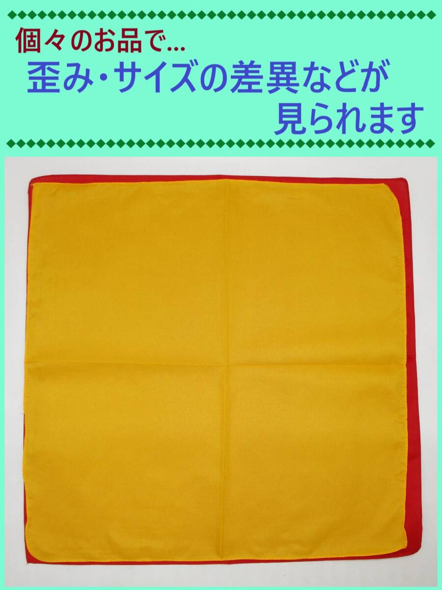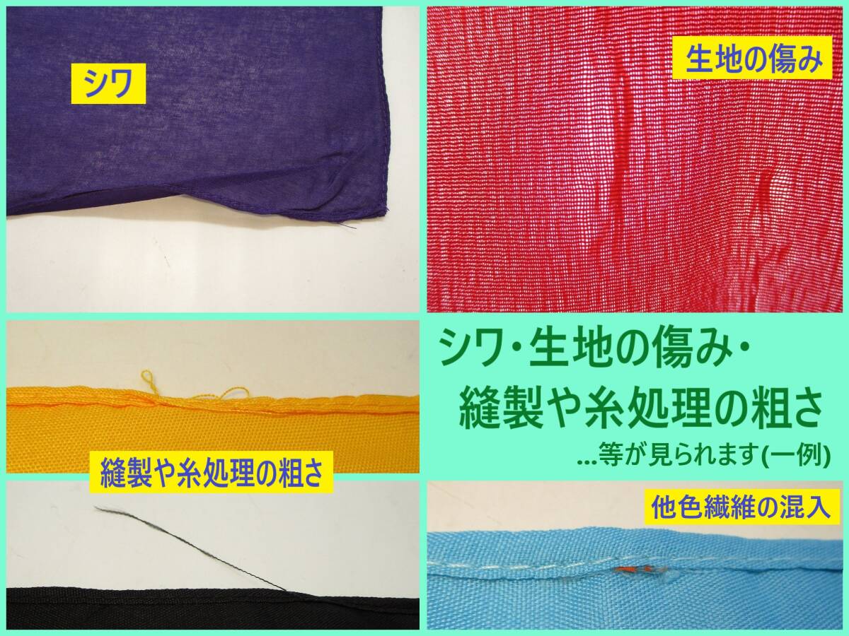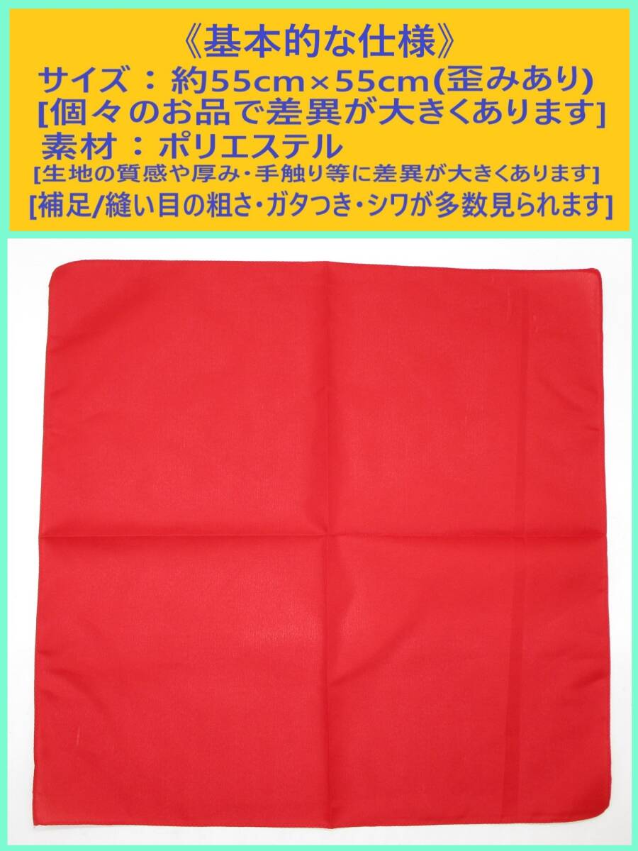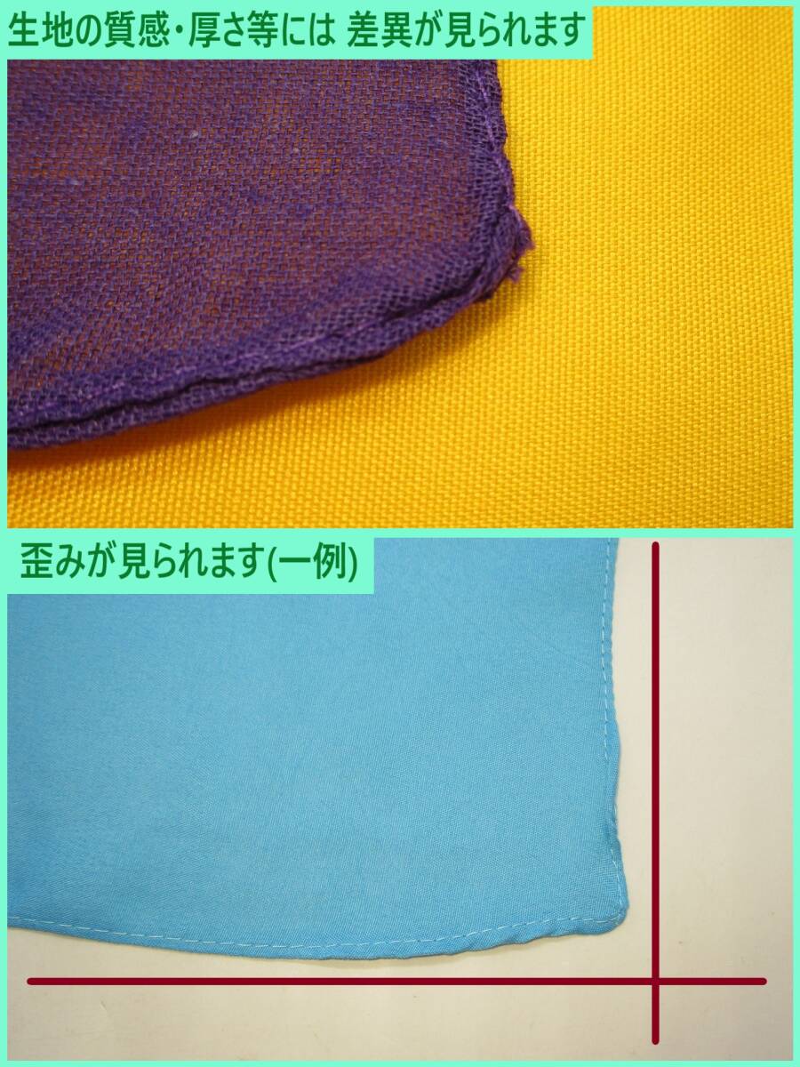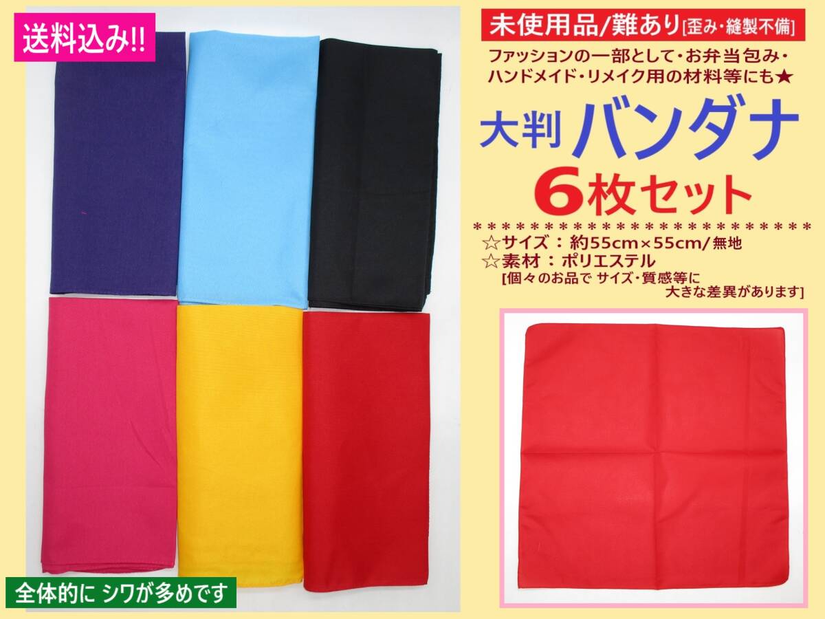 | 「難あり」扱い品。 撮影・確認のため、広げる等しましたが、未使用品です。 専用のパッケージなどの外装は、ありません。 ポリエステル製・無地(模様等なし)、 カラフルな6色の バンダナのセットです。 約55cm×55cmサイズ 正方形に近い形状のお品ですが 個々のお品ごとに、サイズの差異、形状の大きな歪み、 生地の質感や厚み・手触りなどに大きな差異が見られます。 また、縫い目・縫い糸の処理や縫製自体に不備が目立ちます。 (参考:画像7~9、他) お弁当などを包むのにお使いいただけるほか、 ハンドメイド材料や リメイク等に お使いになれるかと思いますので 「難あり」として安価にて出品いたします。 あらかじめご了承ください。 以下の商品説明をよくご覧になってから、ご検討をお願い致します。 神経質な方、完品をご希望の方は、御入札をご遠慮ください。 【商品内容】 大判 バンダナ 6色・6枚セット カラー:6色/画像3~5をご参照下さい 素材:ポリエステル *生地の質感や厚み・手触りなどに大きな差異が見られます サイズ:約55cm×55cm 正方形に近い形状 *お品ごとに大きく差異があります *形状に歪みが見られますので 正確な正方形ではありません 重量:6枚で 130g程度 その他: 海外製 メーカー等の詳細は 不明 乾燥機など 高熱での環境下で 縮み・印刷のにじみ等が起きるという報告があるようです 乾燥機のご使用やアイロン掛けには 対応していないと思われます 参考にどうぞ *状態などは画像にてご確認ください *実際の商品の色味とは異なる場合があります 【状態等】 ・撮影・確認のため、広げる等しましたが、未使用品です。 ・専用のパッケージなどの外装は、ありません。 ・形状の大きな歪み、シワやヨレ、部分的な汚れ、 縫い目・縫い糸の処理や縫製自体に不備が目立ちます。 また、他色繊維の巻き込み、引き攣れ、 製造上の糸くずの付着が見られます。 美品・完品をご希望の方はご遠慮ください。 (参考:画像7~9、他) 以上の点より「難あり」として安価にて出品いたします。 ご承知いただける方のみ ノークレーム・ノーリターンにて ご検討ください。 【補足】 長期保存品、及び、 ゆうパケットにて発送できるサイズに小さく折りたたんでいるため、 シワ・折れ目が見られます。 画像にてご確認ください。 (発送時の状態/画像10) | ||