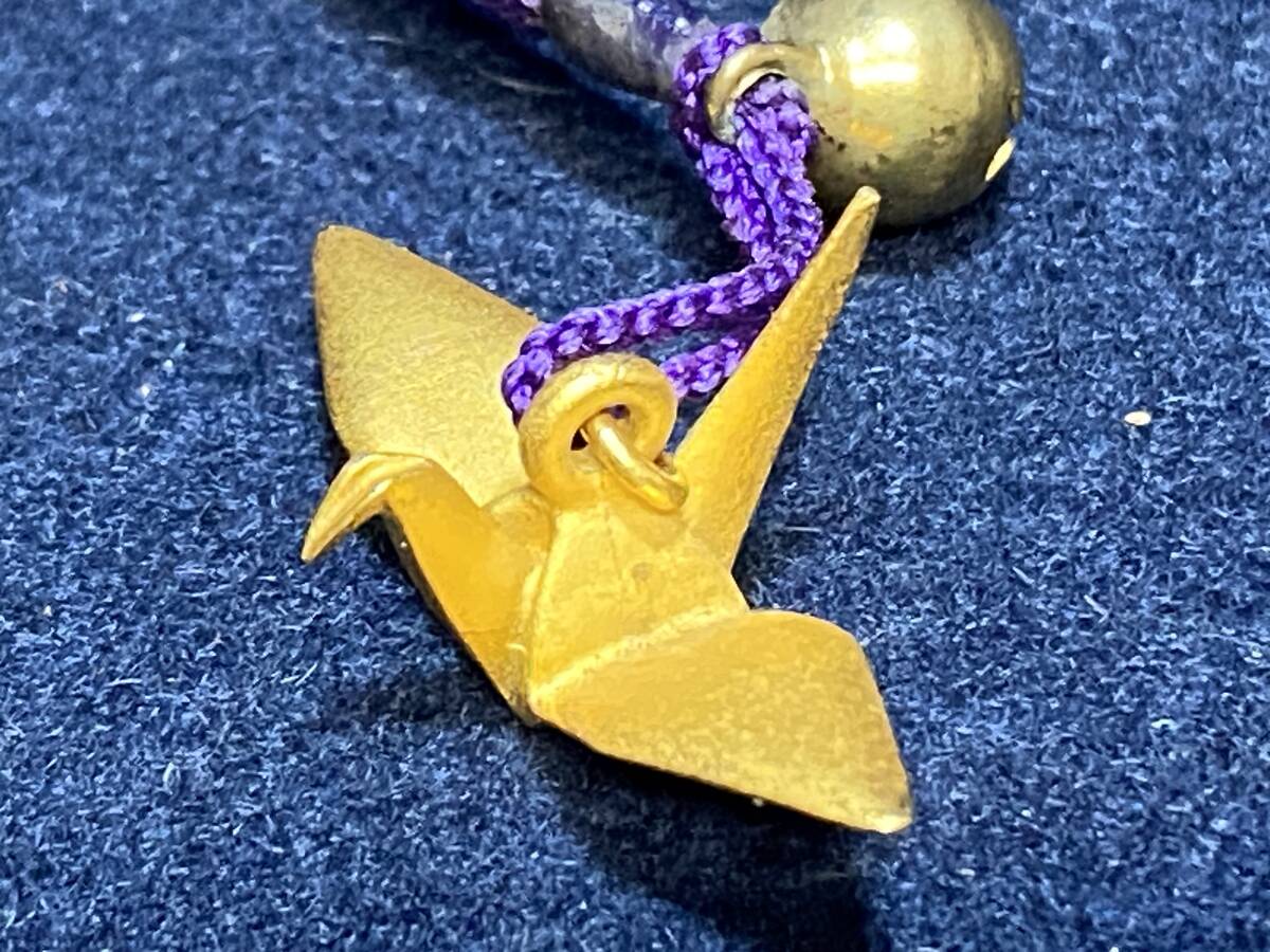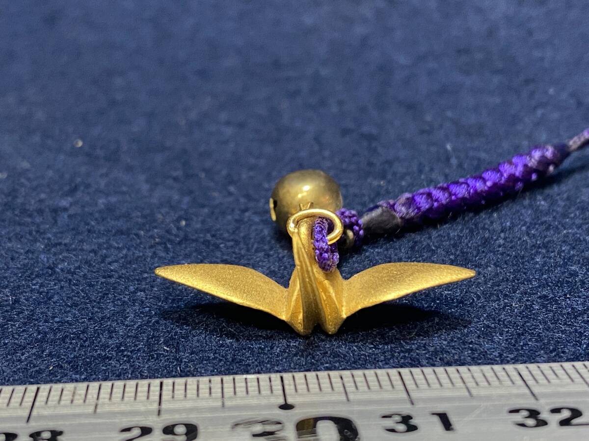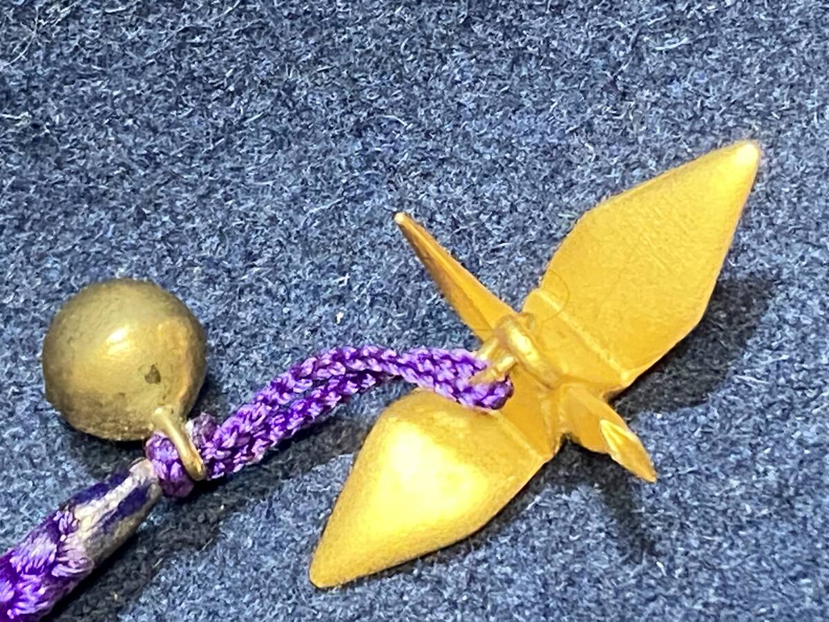 非鉄金属 金色 の 鶴 と鉄製 小鈴 の有る紫色の紐が付いて居ります。