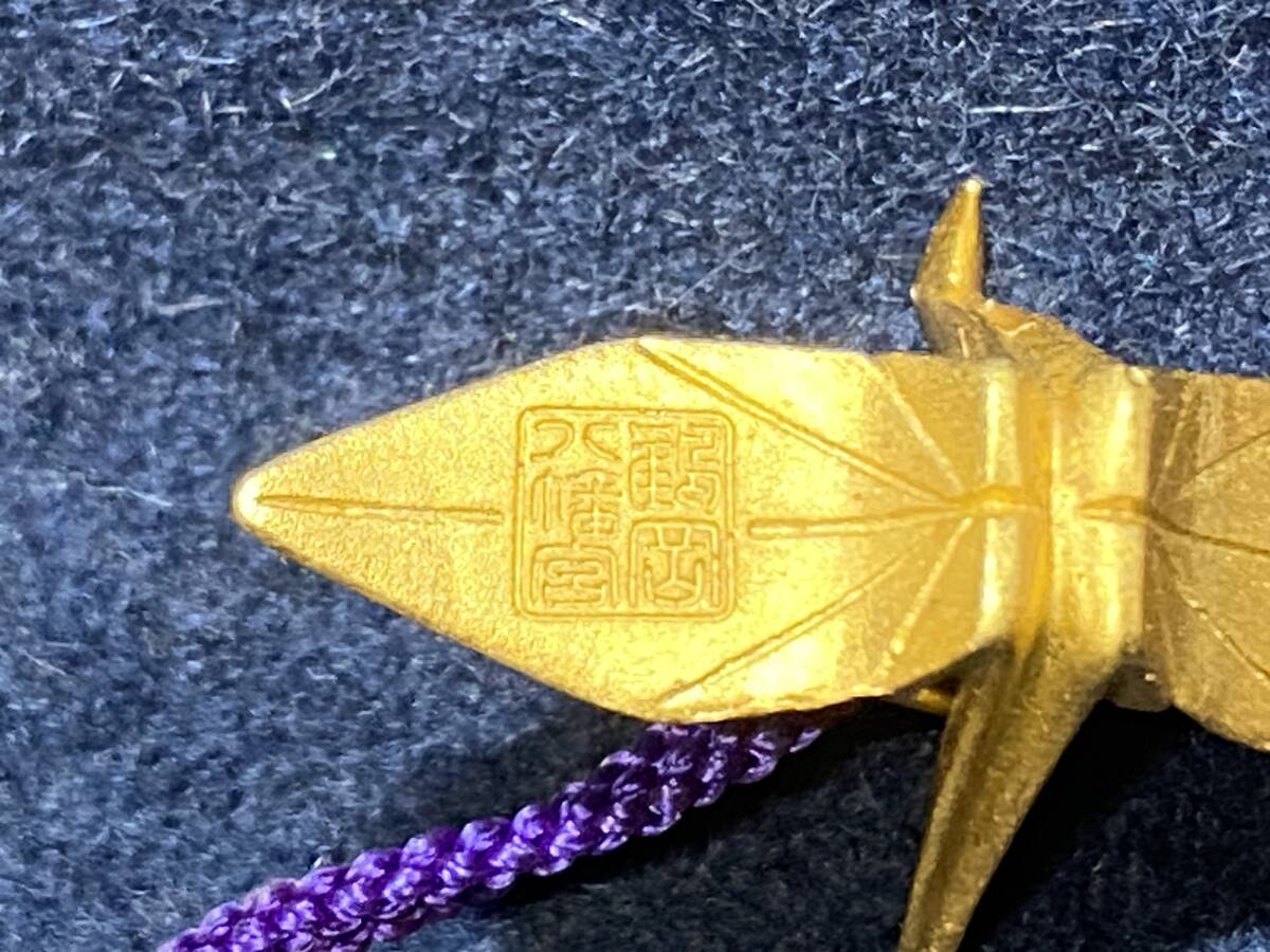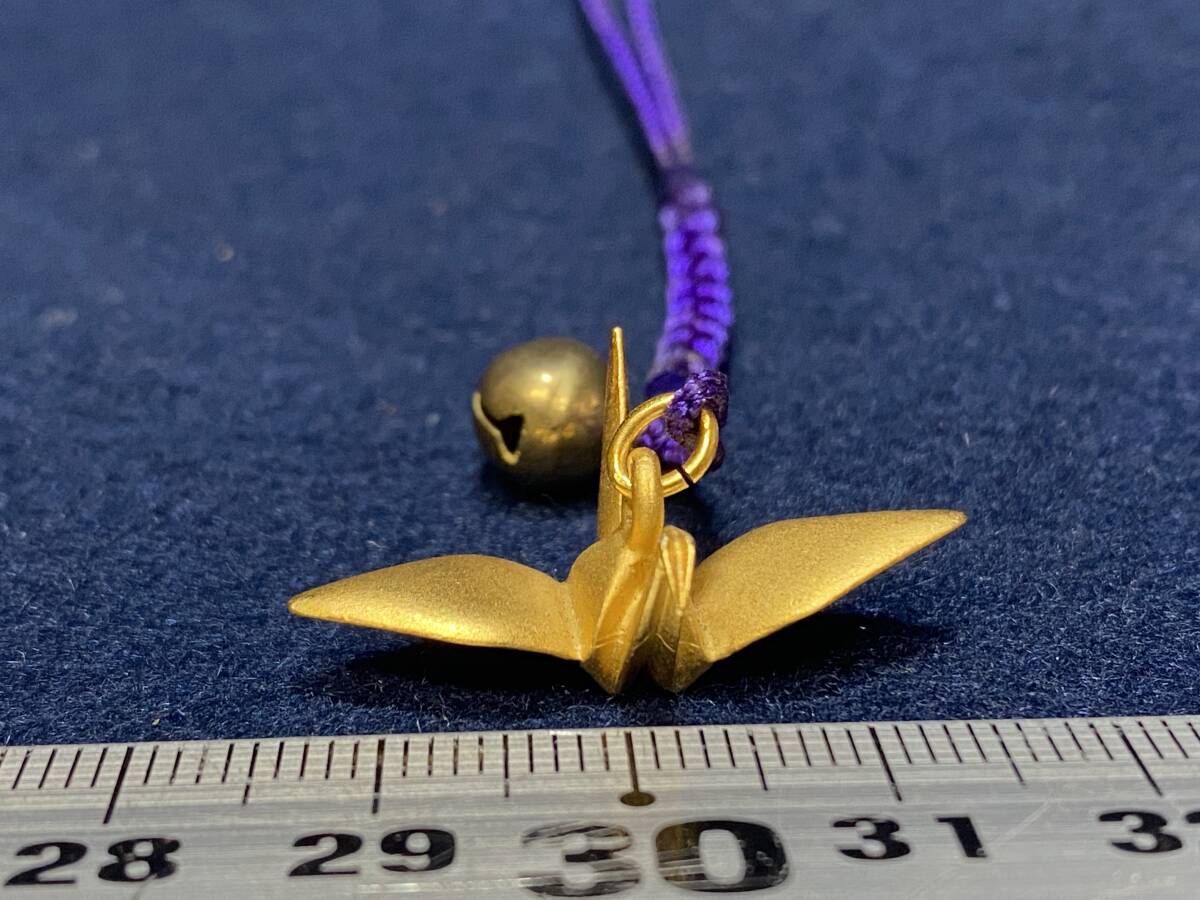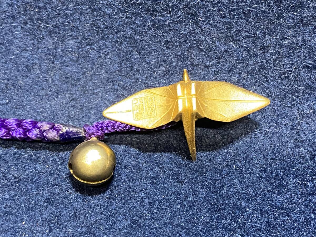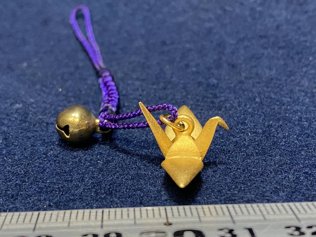 鶴岡八幡宮 刻印 ストラップ キーホルダー 根付 提げ物 非鉄金属 金色 折り鶴 鶴 千羽鶴や鶴の恩返しのモチーフ 鉄製 鈴 小スズ 付き燻し金