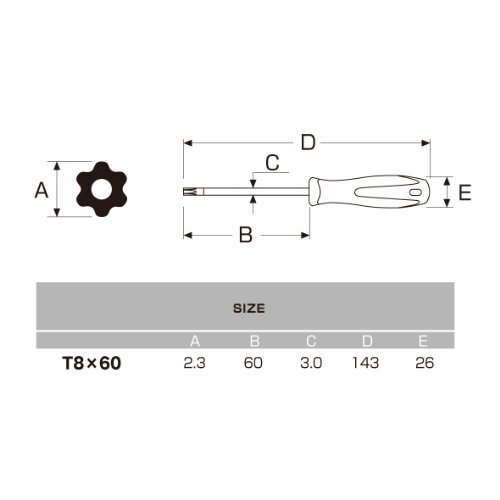 「アネックス(ANEX) ドライバー ヘクスローブ T8x60 穴付 No.6300」▼4962485020439▼(商品説明)1本・ブラック T8(穴あり) No.6300・・Size:T8(穴あり)・トルク伝達率が高いヘクスローブ(6つ溝)ネジ用ドライバー・ハンドルは四角に近い断面形状で力をかけやすい・先端サイズ:T8(2.3mm)、穴あり・製品寸法:全長143mm、軸長60mm、軸径3mm、ハンドル最大径26mm・マグネット:なし説明 商品紹介 ●トルク伝達率が高いヘクスローブ(6つ溝)ネジ用ドライバー ●ハンドルは四角に近い断面形状で力をかけやすい ●先端サイズ:T8(2.3mm)、穴あり ●製品寸法:全長143mm、軸長60mm、軸径3mm、ハンドル最大径26mm ●マグネット:なし ●包装形態:フック付 より ●ヘクスローブ付ネジ部品と締め付け工具は、軸に平行な側面ではまり合うため、締め付け時の滑り及び工具の外れ(カムアウト)がなく、確実な締め付けができる ●広い面で理想的な角度でトルクが伝達されるため、トルク伝達に付随したネジ部品の形状のくずれがない ●同様の理由から締め付け工具の割れや磨耗が少なく、工具の寿命が著しく伸びる ●ドライバーの先端部をメッキ層の厚みの影響を受けない高精度仕様に仕上た ●理想的なネジとのカン合により耐久性を大幅アップ ●いじり止め付ネジにも対応