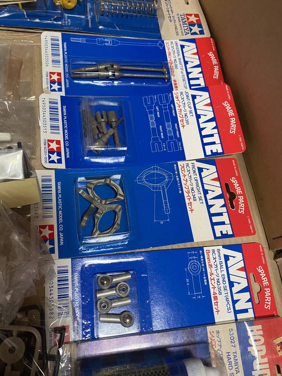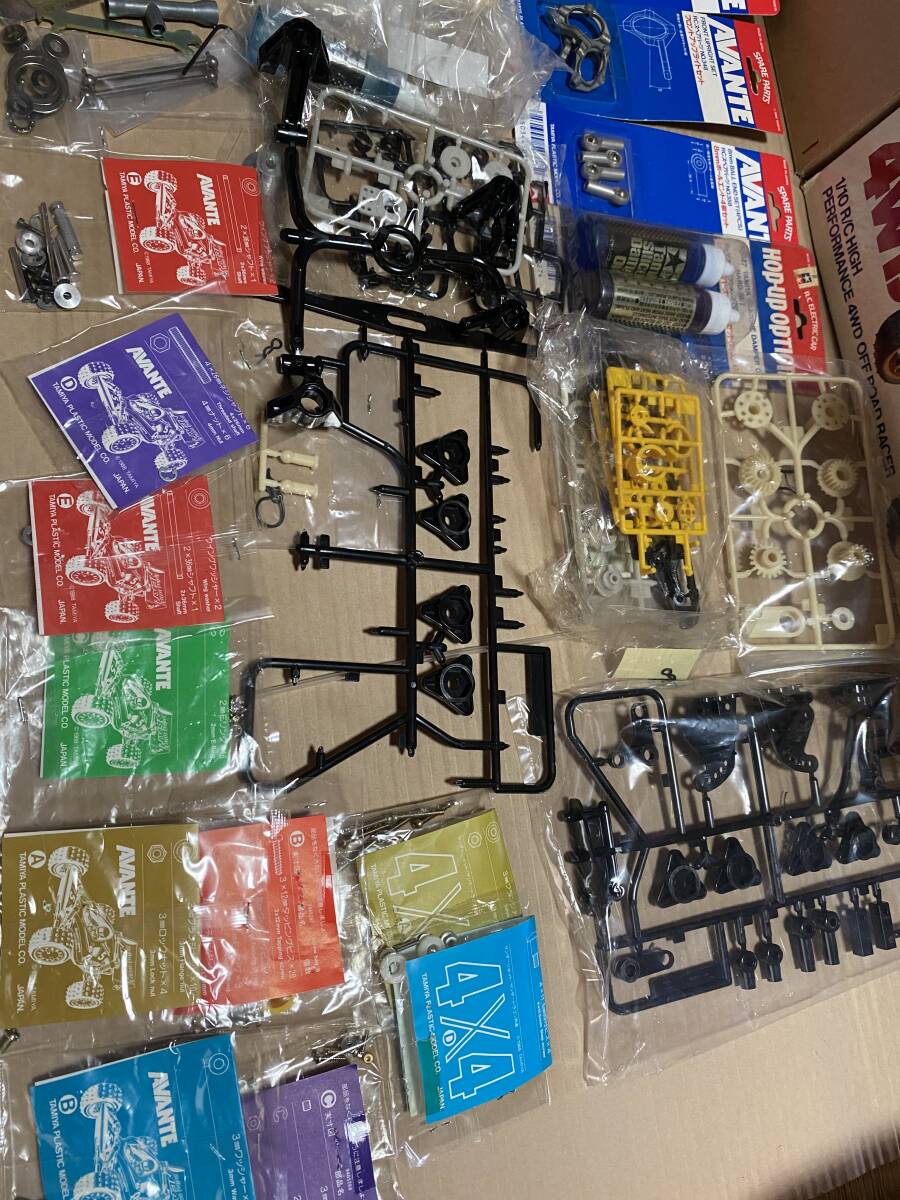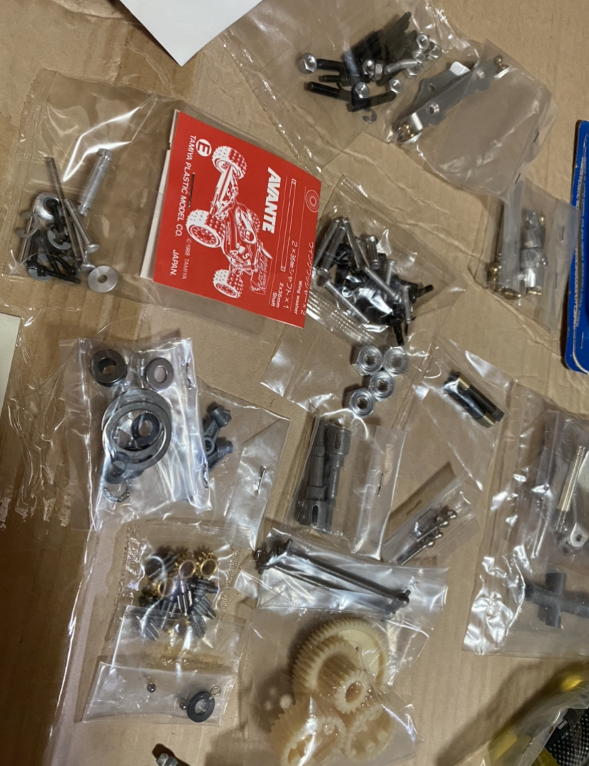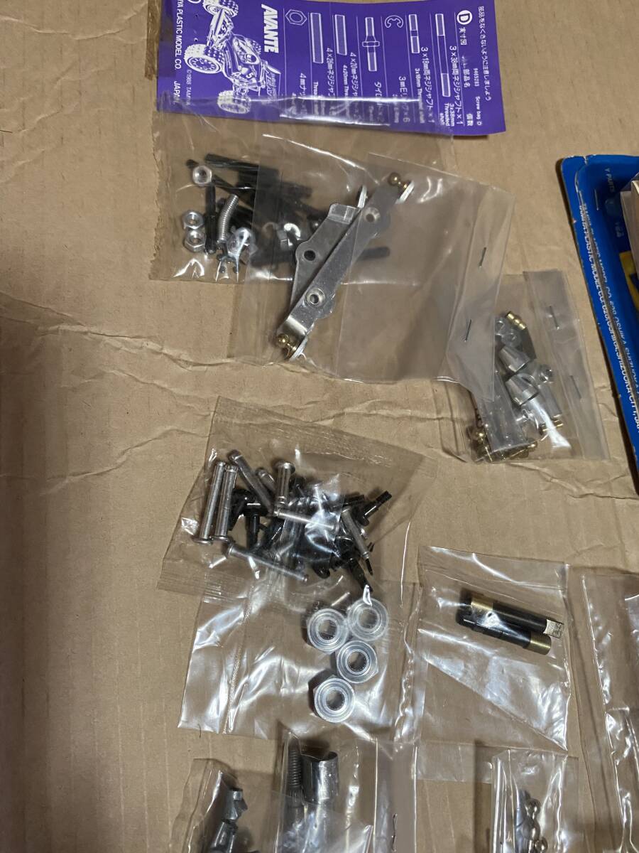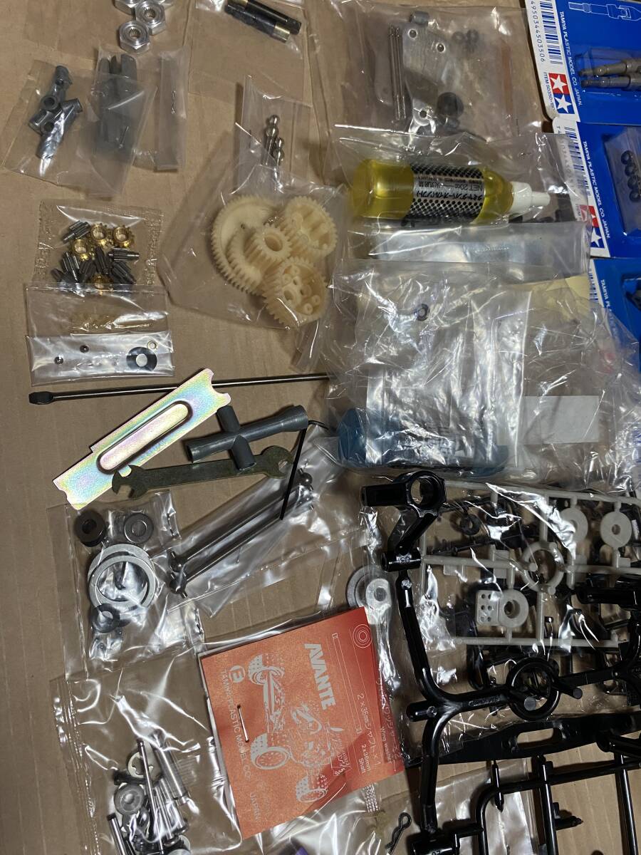 ライナーにつながったままの新品パーツや、タミヤから取り寄せたアルミパーツの袋入り、新品ギア、新品ネジなどがあります。写真で判断お願いします。
