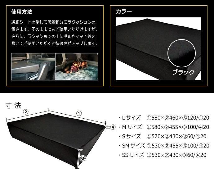 ※適合表データは、スタッフが独自にクッションを当て合わせて調査したデータです。適合表はあくまで参考程度にご覧いただき、実車にてサイズ確認を行った上でお求めください。なお、当製品は汎用品につき、装着方法など装着に関するご回答はできかねますので予め実車にて確認等を行ってからお求めください。