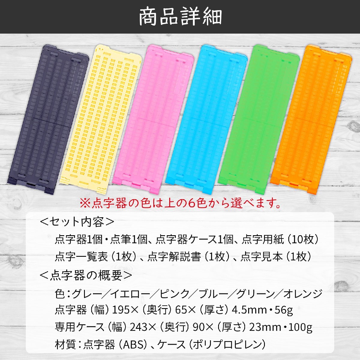 商品は、点字器1個・点筆1個・点字器ケース1個・点字用紙(10枚)・点字一覧表1枚・点字解説書1枚・点字見本1枚です。点字器サイズ(幅)195×(奥行)65×(厚さ)4.5mm / 専用ケースサイズ:(幅)243×(奥行)90×(厚さ)23mm重さ:点字器:56g / ケース:100g ●材質:点字器:ABS /ケース:ポリプロピレン【点字器の機能】 この点字器は、名刺に点字が打ちやすいように、名刺を固定するガイドを付けたり、タックテープ9ミリ、12ミリがセットできるガイド穴を設置したり、さまざまな使い易い工夫がしてあります。また、点字器を収納する透明プラスチックケースも付属しているので、持ち運びにも便利です。【初心者向けの点字器】 この点字器セットは、初心者でも簡単に学習して効果的に使用できます。点の形状から点筆の針先まで、すべての形状を見直し書きやすさを追求しました。初心者からベテランまで広くお使いいただけます。覚障害者にとっても健常者にとっても優れた学習セットです。使いやすく、軽量で、バッグに入れて持ち運び、屋外に持ち出すことができます。