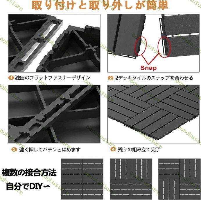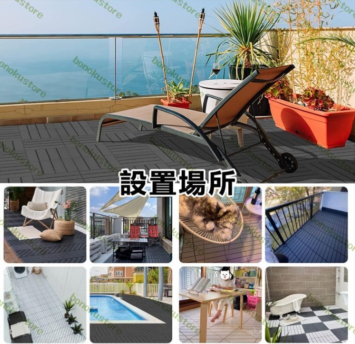 【軽量でも頑丈】高硬度プラスチック製。 ウッドデッキタイルほど重くなく、耐荷重性に優れています。 高密度プラスチックは安定性が高く、膨張しにくく、直射日光、大雨、吹雪に耐えることができ、一年中使用できます。 当社のプラスチック製デッキ タイルは、木材よりも優れた耐水性を備えています。 より耐久性があり、耐腐食性があり、腐敗やバクテリアの繁殖が少ない。