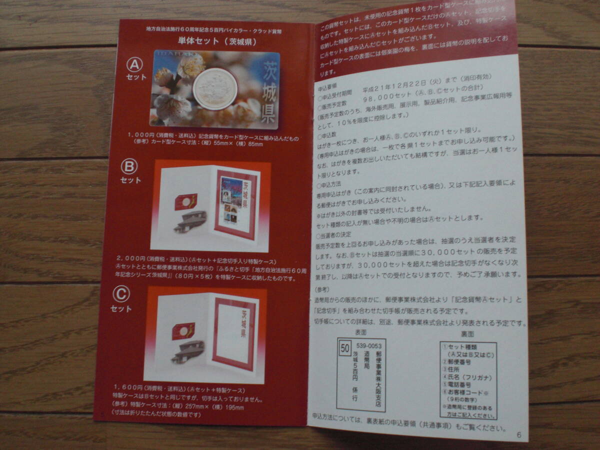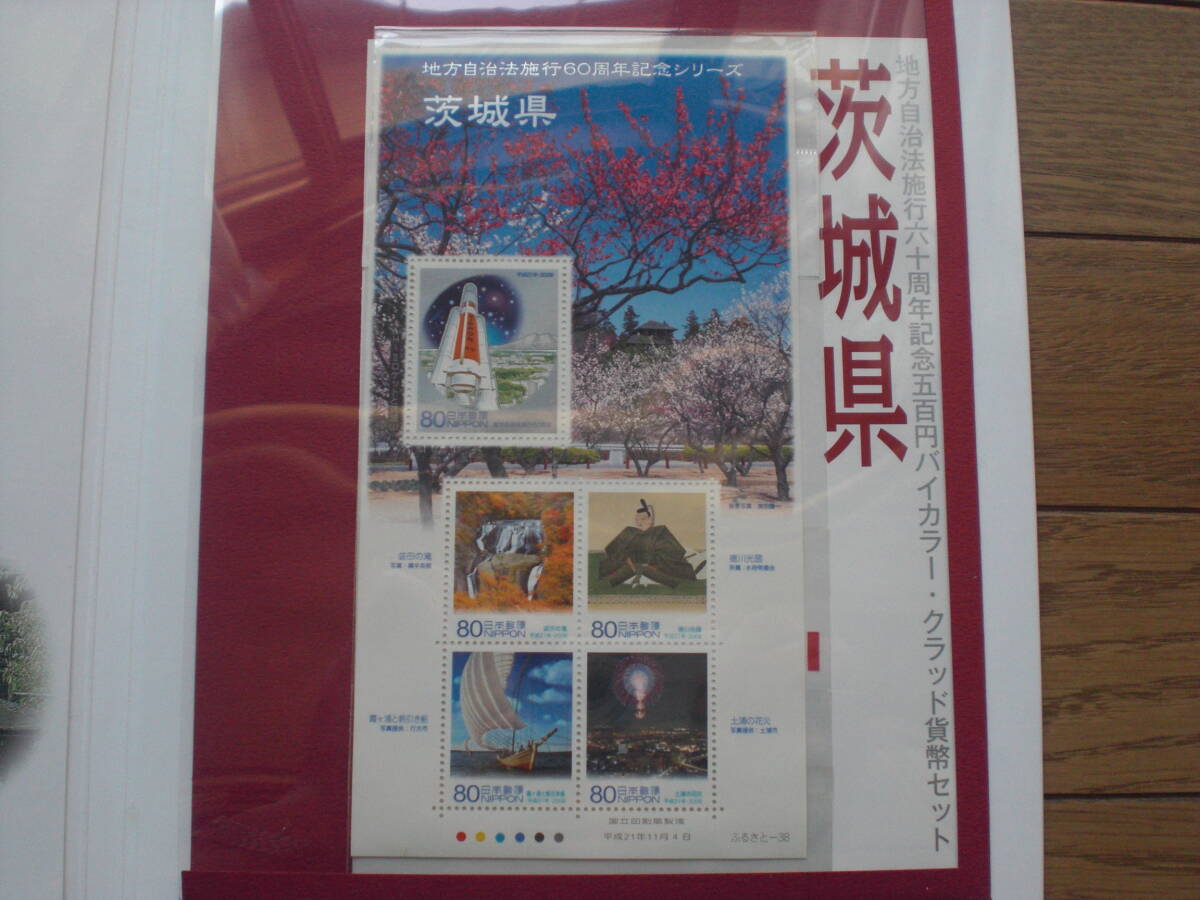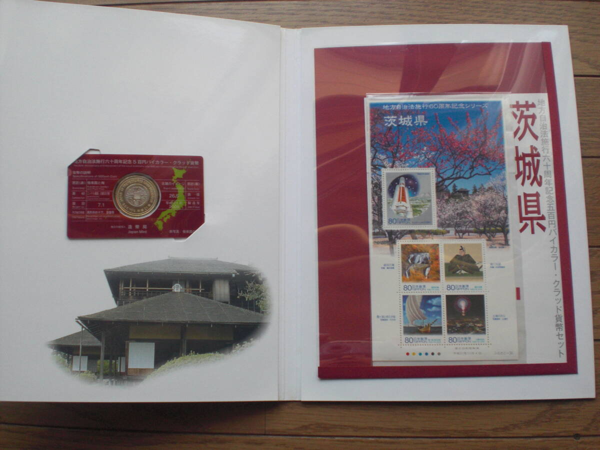 地方自治法施行六十周年記念 五百円バイカラー・クワッド貨幣単体セットBセットの茨城県  記念切手付き