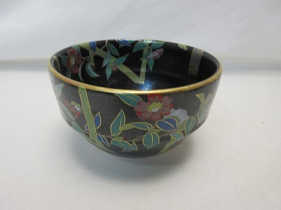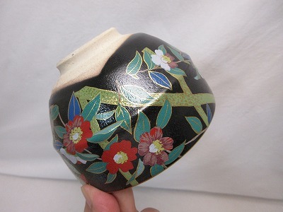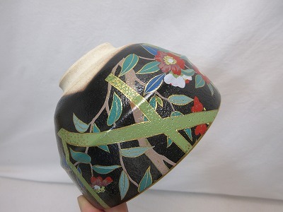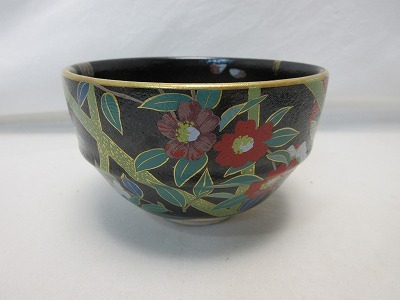 | J07009 【 ほぼ未使用 茶道具 金彩花絵 金縁 黒 茶碗 陶印 作者不明 箱無 】 検) 煎茶道具 茶事 茶会 茶器 お点前 来客 おもてなし ⅰ | |||