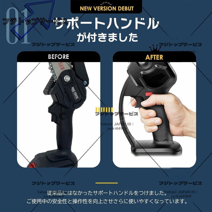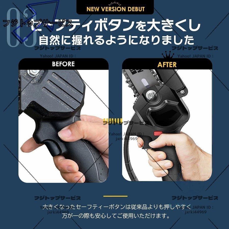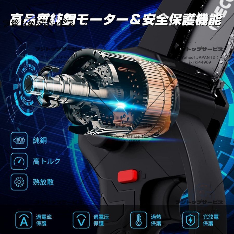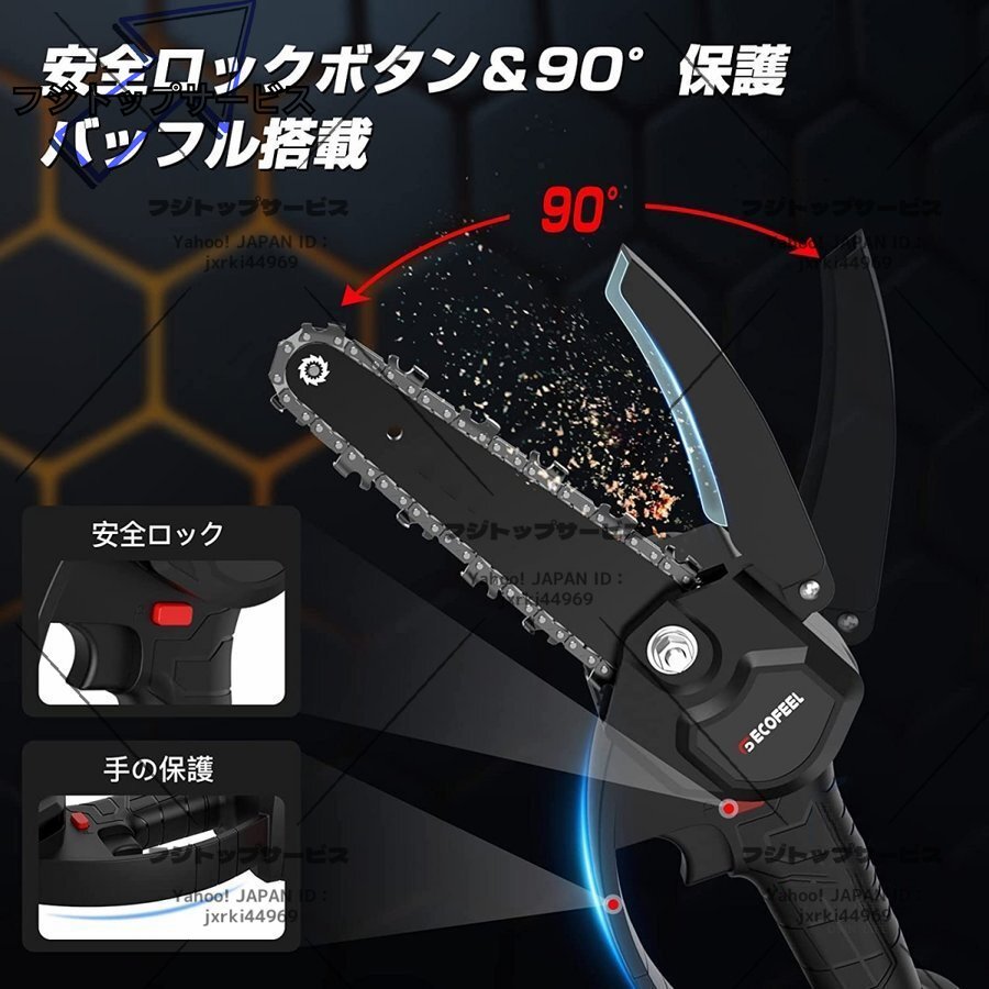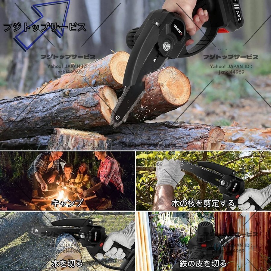 【高品質純銅モーター&安全保護機能】 強力な純銅モーターを利用するミニチェーンソーは超強動力を提供するとともに、振動によるエネルギー損失を減らし、消費電力を削減します.それに、ハイパワーの電動工具として、安全保護も欠けません!モーターに過電流保護と過電流保護機能を持っていて、また、バッテリーにも過温度保護や短絡保護など、様々な自保護機能がついています.これにより、潜在的なリスクを回避できて、長時間安心・安全に作業をすすめられます!