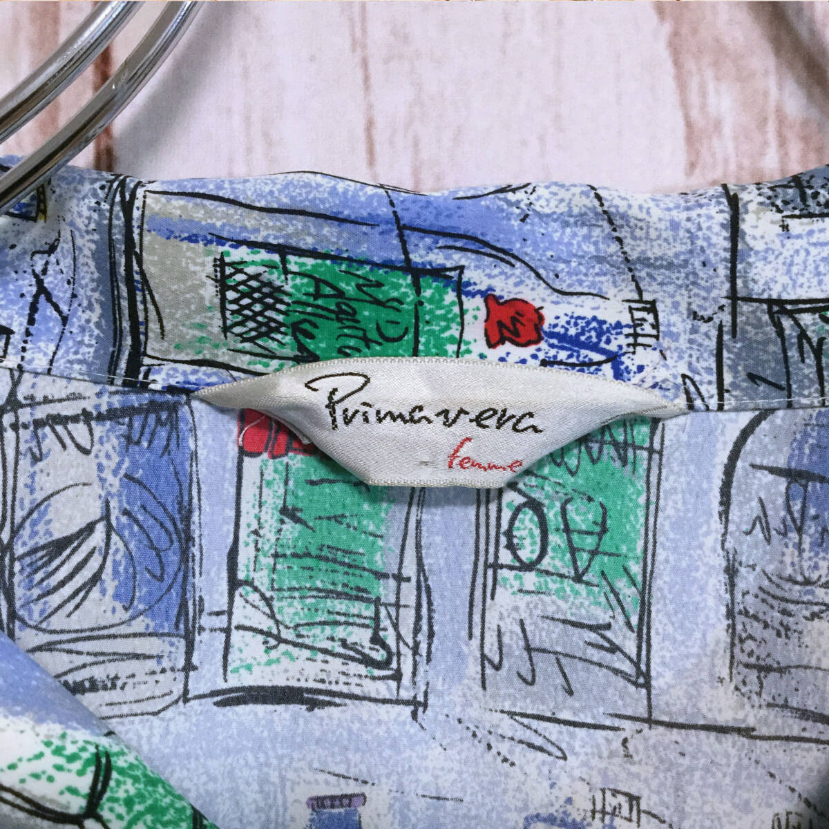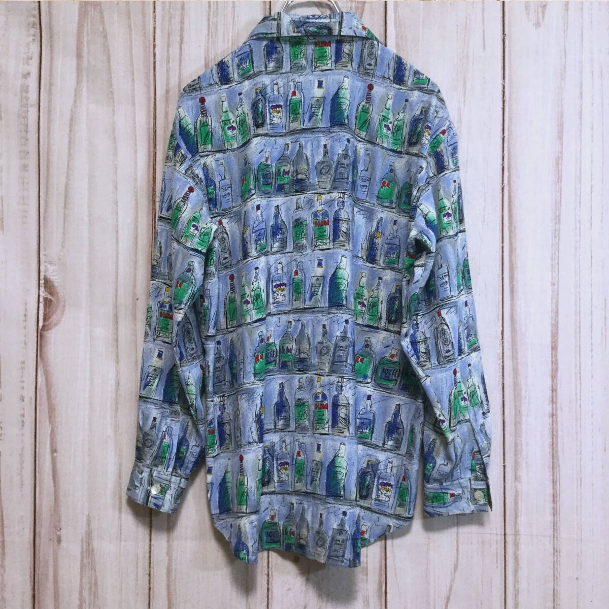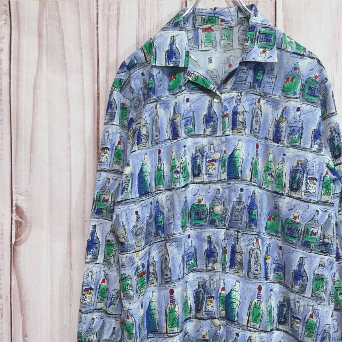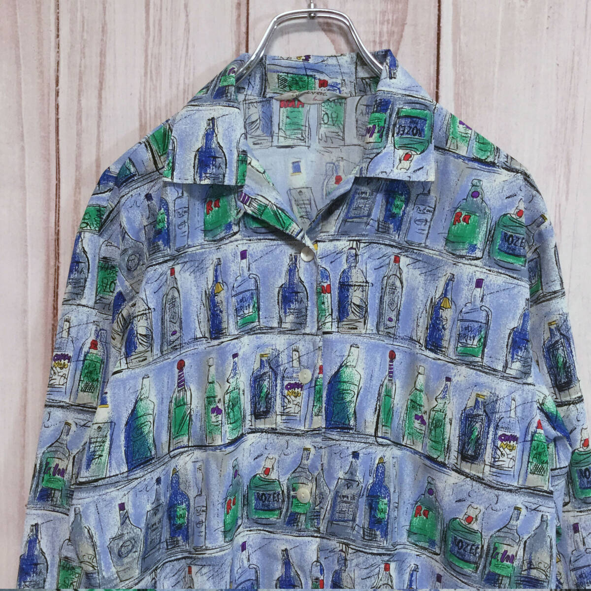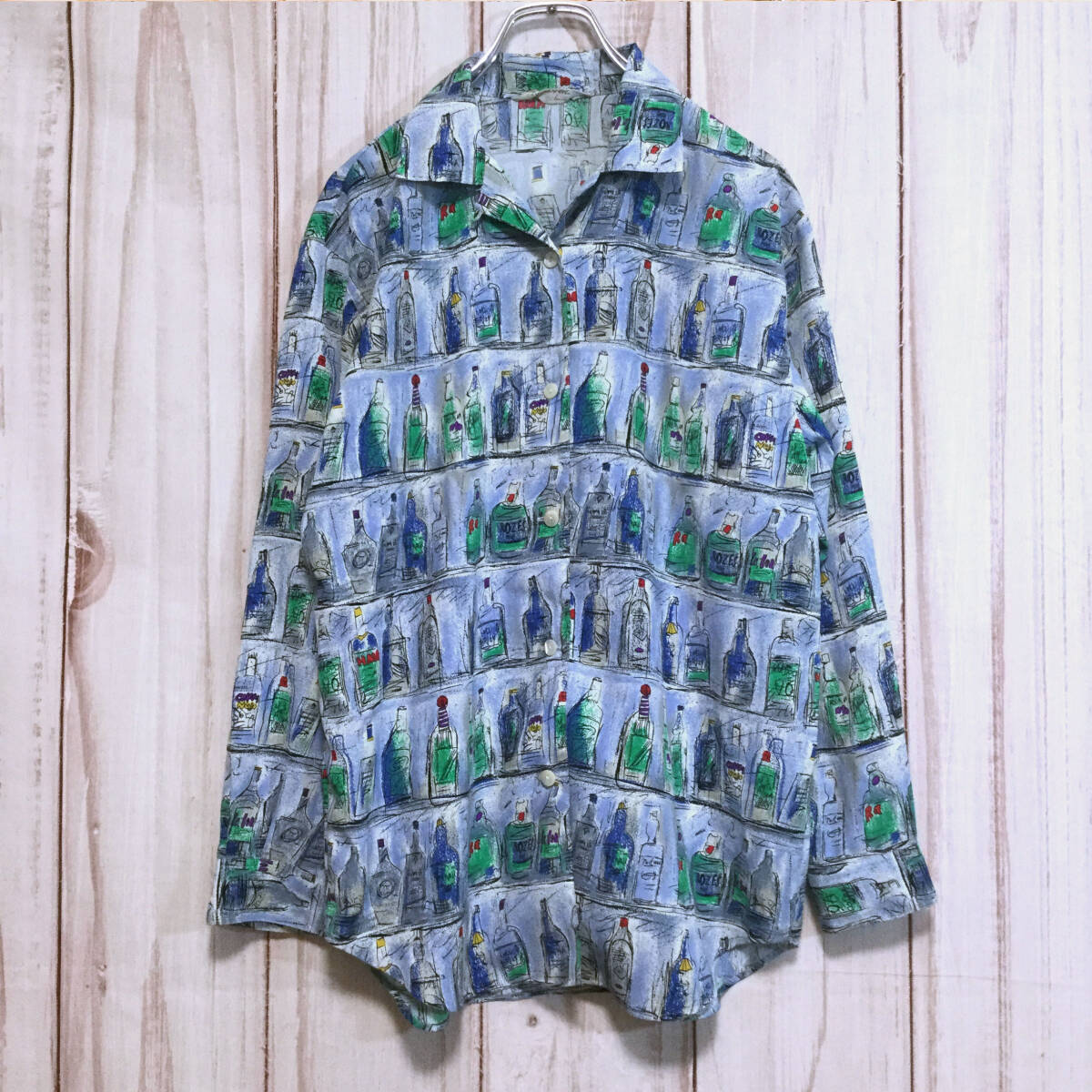 【長袖シャツ】 レトロ オープンカラー オーバーサイズ ボトル柄 ヨーロピアン L相当 水色 古着 [231022-019]