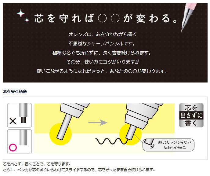 「芯を出さないで書く」という使い方を可能にしたため、力をこめても芯が折れない。