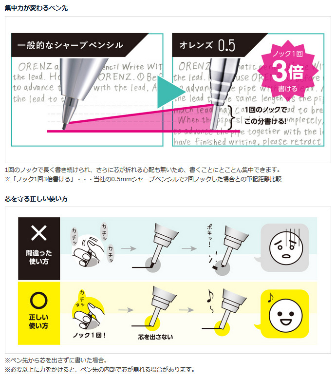 先端パイプの分だけ長く書けるため、ノック1回の筆記量が一般的なシャープペンシルの3倍書ける。