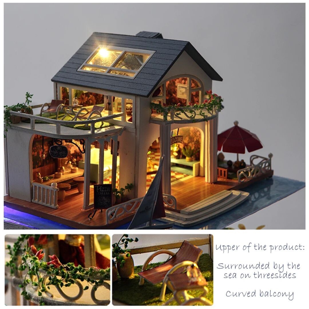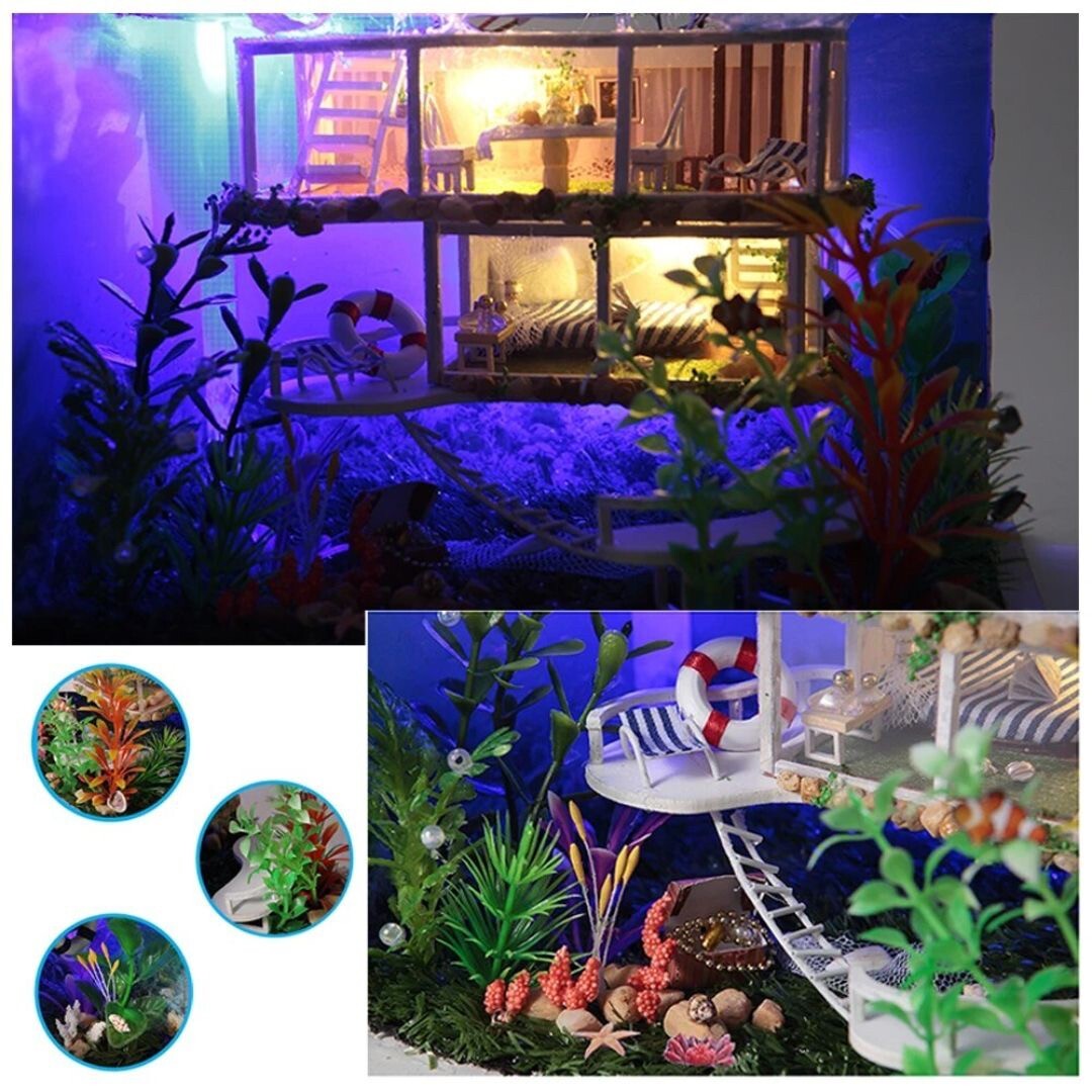 このLEDライト付きのミニチュアドールハウスは、ベッド、ソファ、窓、ランプ、植物など、多くの部品を使ってあなただけのおしゃれな海の家を作ることができます。