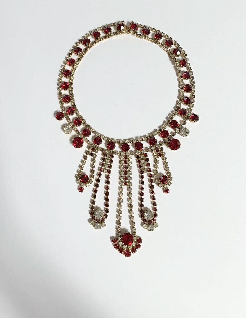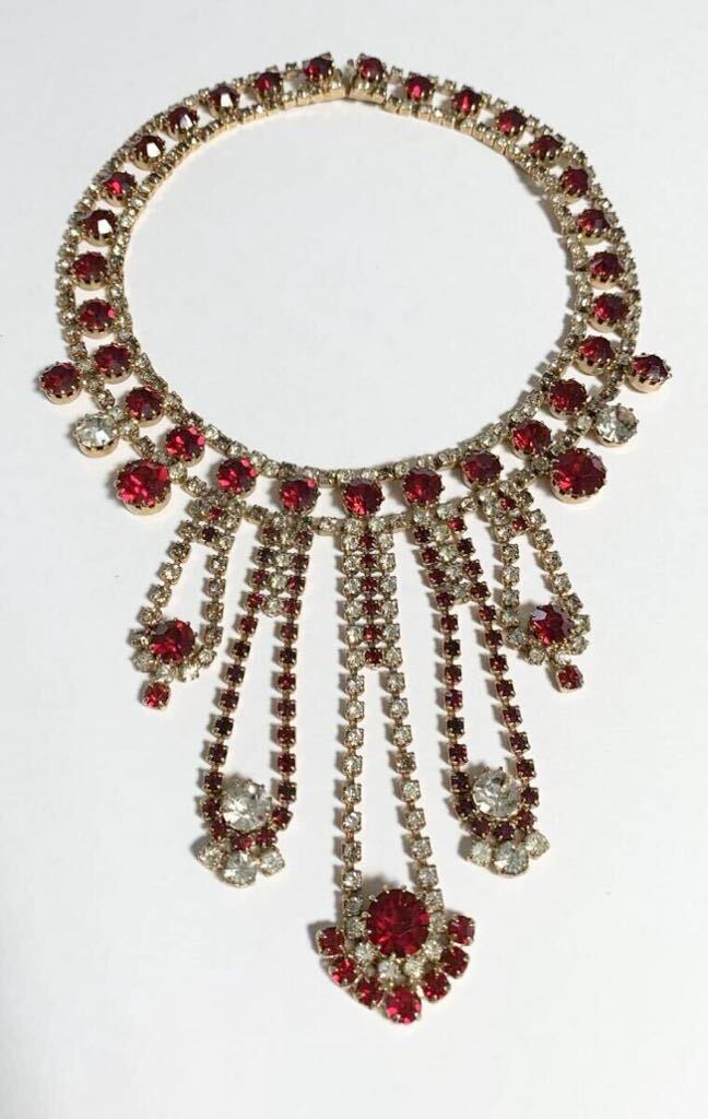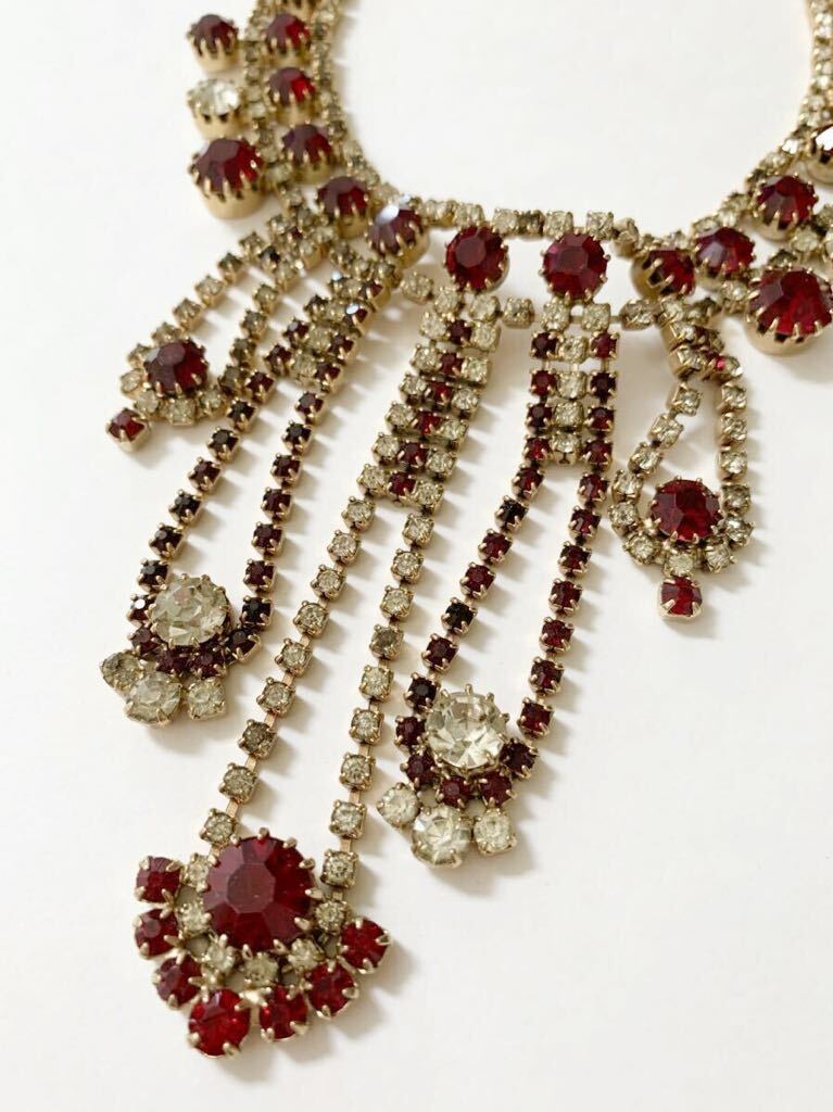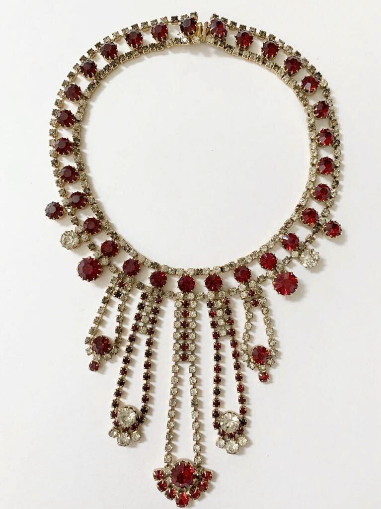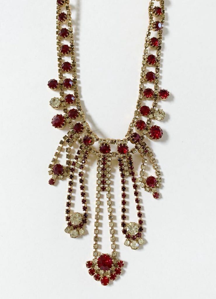 【希少】1980s チェコガラス アンティーク ネックレス コスチュームジュエリー 真紅 赤 クリア ストーン ビジュー 舞台衣装 インテリア