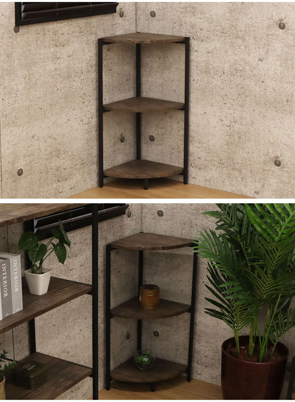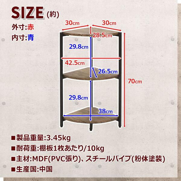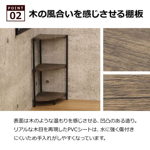・ヴィンテージ調の木目柄が美しい、落ち着きあるブラウン×ブラックのコーナーラックです。・フレームはサビに強い粉体塗装を施しているため、キッチンなど水回りでのご使用にもオススメです。・棚板表面は木のような温もりを感じさせる、凹凸感のある造りです。・リビングや玄関脇のインテリア小物置き、トイレ個室のトイレット用品置きなど、お部屋の隅を収納場所にしたいときに。・場所を取らず、小さな収納空間が欲しい際にオススメです。・脚部にはアジャスターが付いており、高さの微調整が可能です。 ※推奨最大伸長:約5mm迄■商品情報・製品サイズ(約):幅30×奥行30×高さ70cm・内寸(約):幅26.5×奥行26.5×高さ29.8cm(上下段共通)・製品重量(約):3.45kg・耐荷重(約):棚板1枚あたり/10kg・主材:MDF(PVC張り)、スチールパイプ(粉体塗装)・付属品:六角レンチ・生産国:中国・お客様組立品・六角レンチが付属しておりますので、組立時の工具の準備が不要です。簡易タイプなので手が痛くなることがあるので軍手などのご使用をお勧めいたします。※モニターの発色具合により、実際の色と異なる場合がございます。
