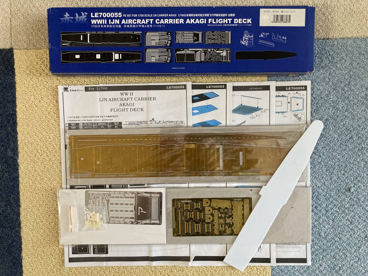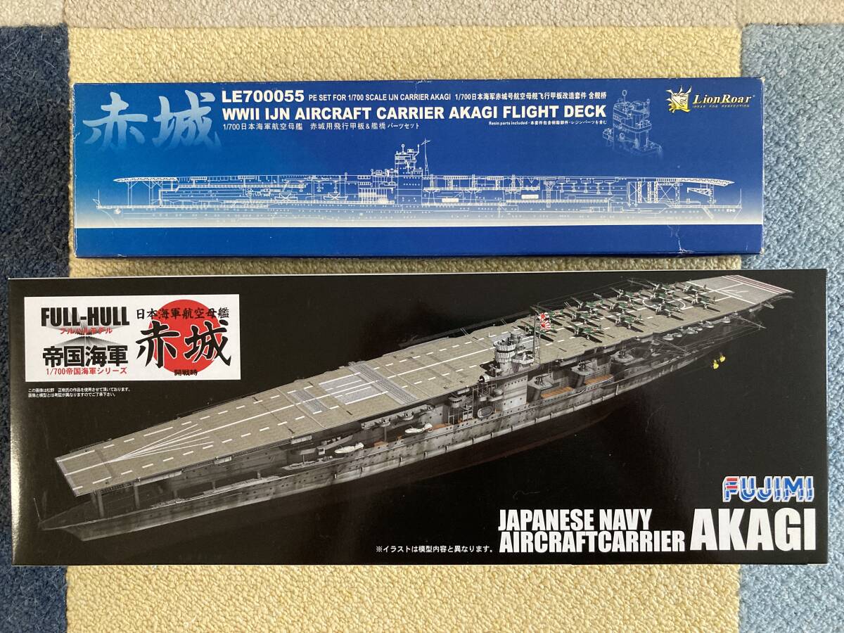 この商品は、フジミより発売された、1/700スケールの日本帝国海軍航空母艦「赤城」フルハルモデルに、フジミ純正の赤城専用木甲板シールセットと、ライオンロア製の同艦専用エッチング製飛行甲板パーツをセットで出品するもので、特に木甲板シールセットは期間限定、飛行甲板エッチングパーツセットは現在生産休止中の入手困難な貴重な商品です。