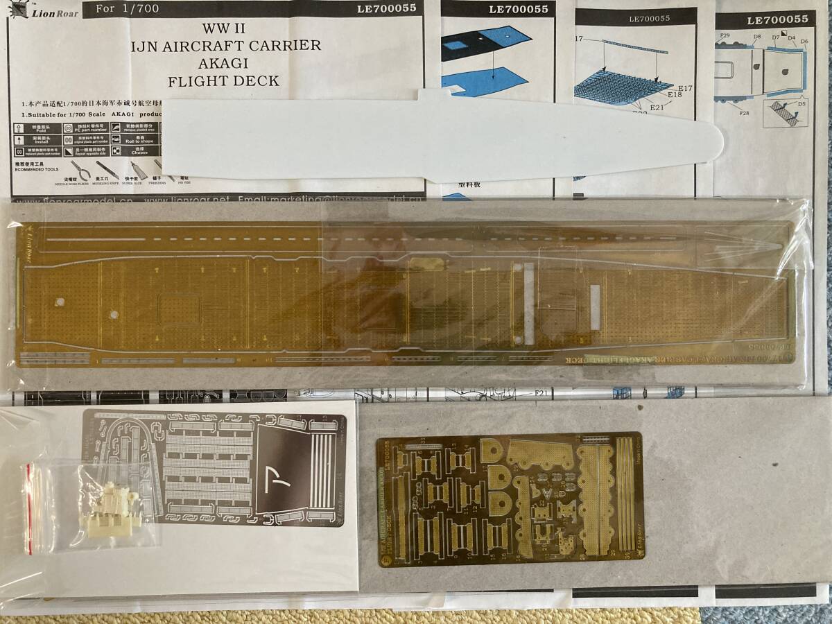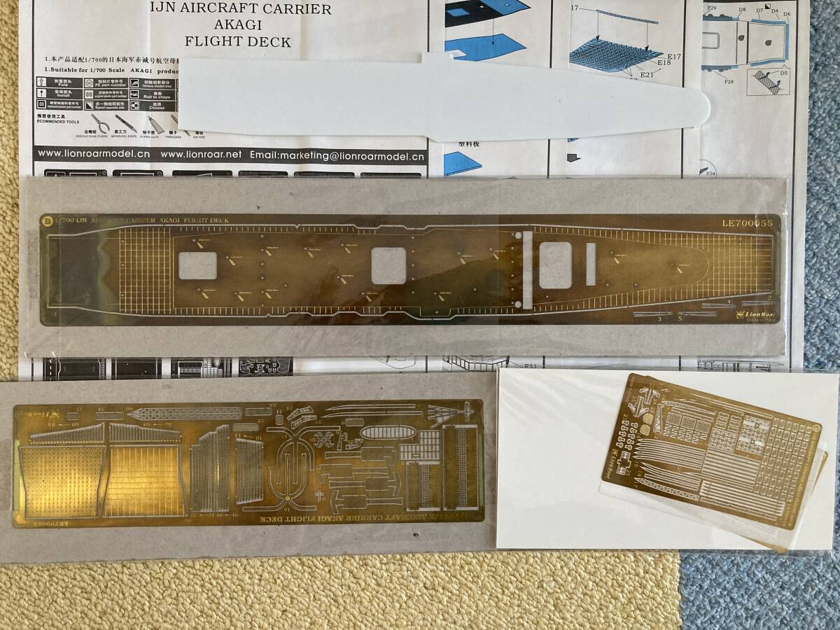 「赤城」フルハルモデルだけでも、後発のフジミ製キットの恩恵を受けて精密な作品が製作できると思われますが、より精密な作品が製作できるよう、フジミ純正の木甲板シールセットとライオンロア製のエッチング製飛行甲板をセットで出品させて頂きます。これらのパーツセットには、木製の飛行甲板用シール及び真鍮製の飛行甲板及び同甲板裏側のトラス構造類、艦載機落下防止ネット、各機銃座や各起倒式マスト類等がパーツ化されたエッチングシートが同梱されています。加えて、レジンキャスト製の精密な艦橋パーツも同梱されています。