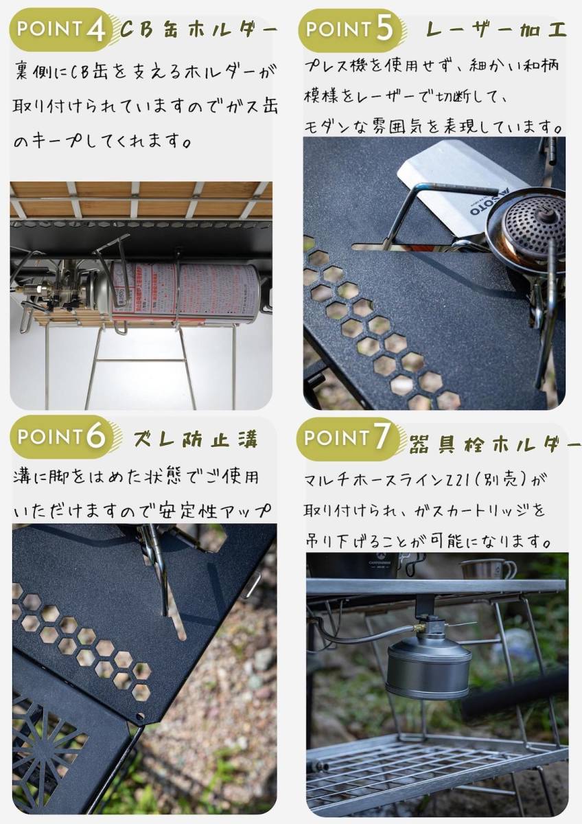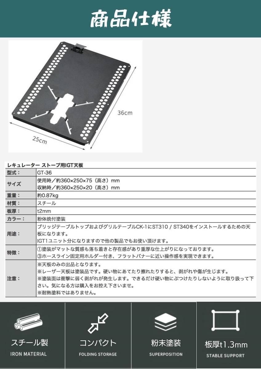 | こちらはsnow peak社のIGT規格にフィットし、SOTO社のレギュレーターストーブST-340及びST-310がセット可能な天板プレートになります。 (※アシストグリップを装着しているST310/ST340には対応しません。) CAMPINGMOON社のIGT用ラックCK-1のセンター7天板や人気ONWAY IGTテーブルのOW-8044 OW-8424 OW-8440 の天板にも併用できます。またラーテルワークスやその他のIGTテーブルにインストール可能なプレートで追加で購入したい方にピッタリです。 Q.フィールドラック T-230には使用できますか? A.連結用天板として使用可能です。 Q.レーザー天板の厚さは? A.約1.3ミリです(塗装の具合によって上下します)。 Q.商品内容を教えてください。 A.IGT天板単品です。 Q.シリコンチューブを付けた状態でセット可能でしょうか? A.シリコンチューブに厚みがあるため装着した状態での取付けはできません。外してご使用ください。 Q.天板やフレームの角の処理はどうなっていますでしょうか? A.天板の角処理はすべて1面とりしてあり、ペーパーを掛けていますので尖ってはいません。これは、打ちキズなどが付きにくくするための処理でもあります。 注意事項※IGT天板のみの出品となります。 レギュレーターストーブは、商品に含まれませんので別途ご用意下さい。 ※スノーピーク社やONWAY社 ラーテルワークス社のIGTテーブルまたはキャンピングムーンのCK1 CK2 フィールドラックブリッジテーブルに適合。 ノーブランド品には適合しない場合がございますので、予めご確認の上ご注文ください。 ※シリコンチューブは外してご使用ください。シリコンチューブを装着したままの状態では取り付けできません。 当店ではこの商品以外にも、国内未発売の多数のアウトドア用品をご用意しております。是非ご覧いいただきご検討お願いいたします。 商品仕様 ブランド:キャンピングムーン CAMPINGMOON 品番: GT-36 パネルサイズ:約250×360×20mm(板厚:2mm) 重量(約)870g 材質:スチール(手塗粉末塗装仕上げ) ※塗装面は衝撃に弱く剥がれが発生します。できるだけ硬い物にぶつけたりしないように取り扱い下さい。気になる方は購入をお控え下さいませ。 カラー:ブラック 分散耐荷重:分散荷重15kg迄(集中荷重(換算値)4kg迄) | |||