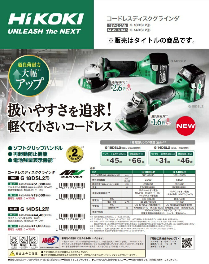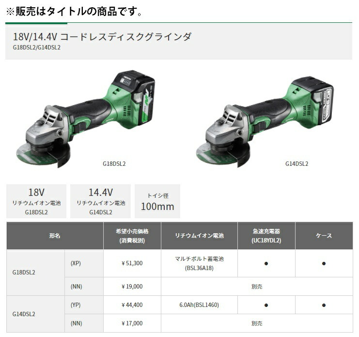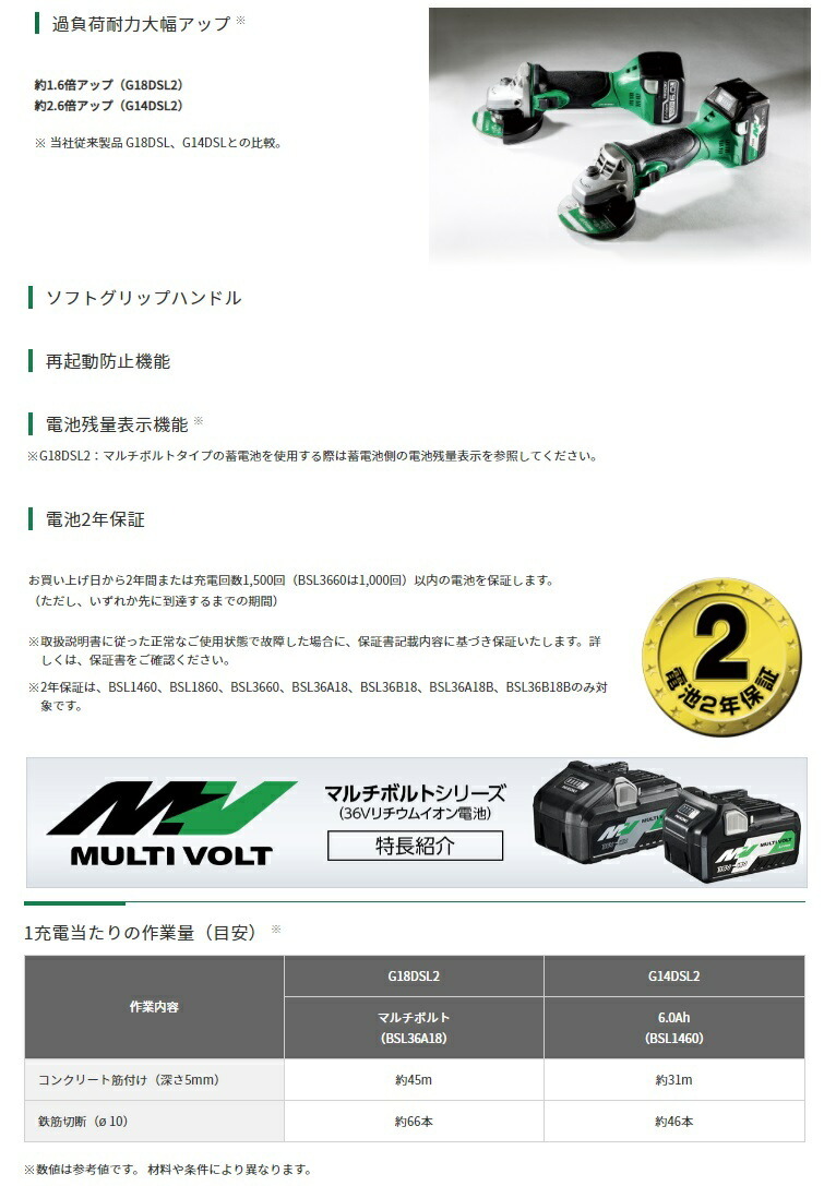HiKOKI ハイコーキ(旧日立工機)18VコードレスディスクグラインダG18DSL2(NN)本体のみです。※バッテリー・充電器・ケースは別販売品です。■過負荷耐力大幅アップ※マキタ社従来製品 G18DSL、G14DSLとの比較。■ソフトグリップハンドル■再起動防止機能