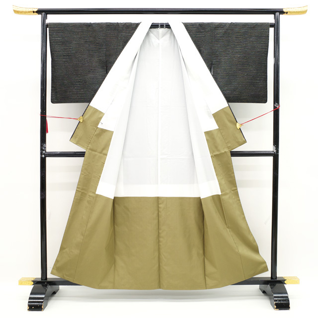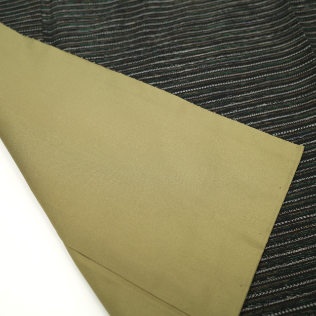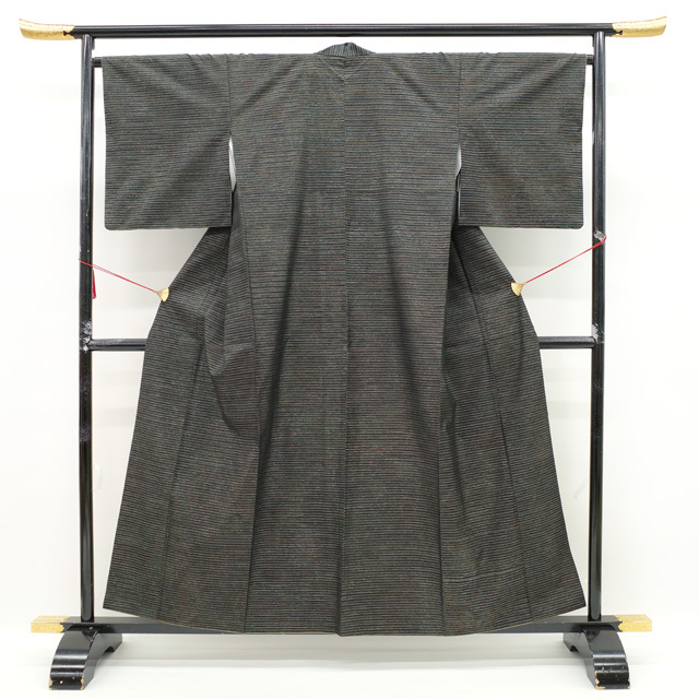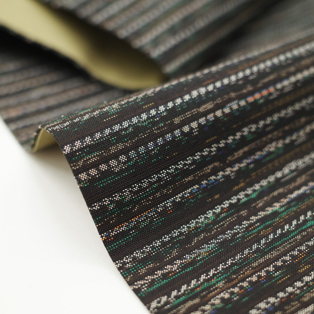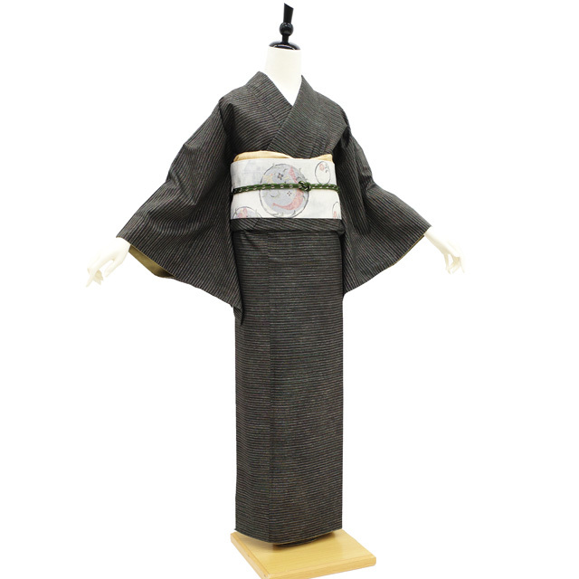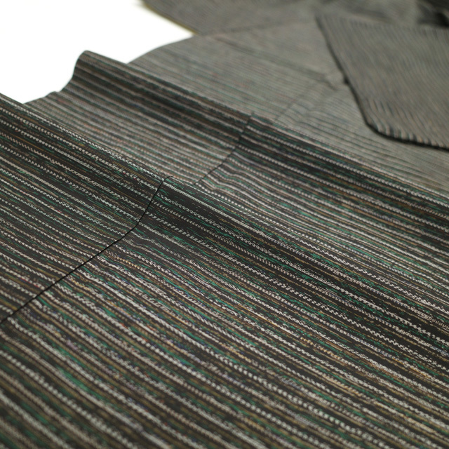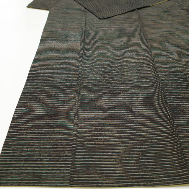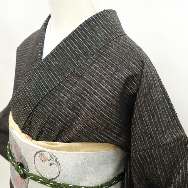 こちらのお着物は、粋な黒こげ茶色地に 緑や黄茶色・白 などで残糸織風の縞が織り上げられています。