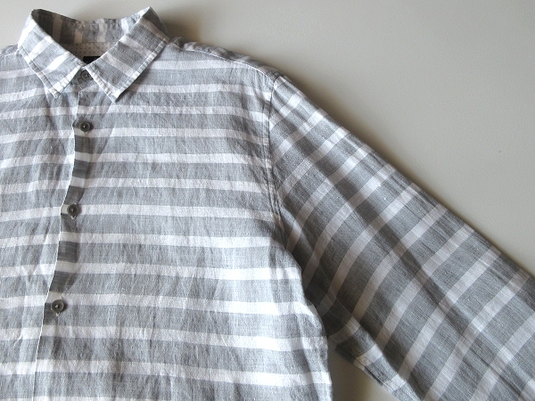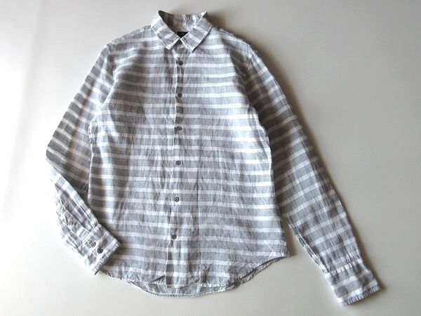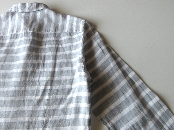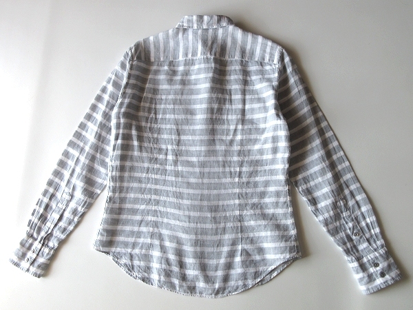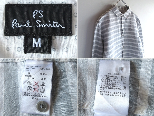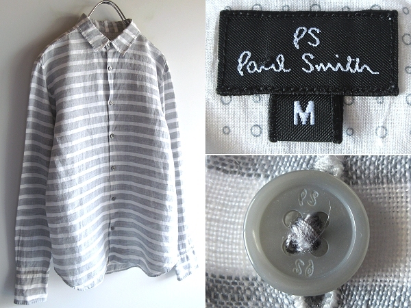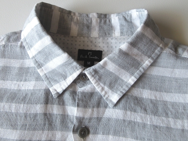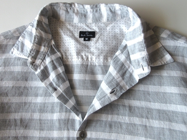 ネコポス対応 PS Paul Smith ポールスミス 袖裏サークルドット柄 ボーダー リネンシャツ M グレー ホワイト 日本製 ジョイックス国内正規品