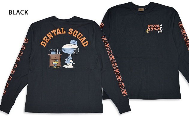 ロウブロウナックルから「ロウブロウナックル×スヌーピー DENTAL SNOOPYロングTシャツ(592404)」のご紹介です。 世界中で愛されている人気アニメ「PEANUTS(ピーナッツ)」とのコラボが実現しました! 今回は歯医者さんに扮したスヌーピーとウッドストックを背中に刺繍しました。 バックにしっかり柄を入れている分、フロントはシンプルに仕上げ、メリハリをつけました。 ボディーには、刺繍に負けないコシのあるTシャツ生地を採用。 | ||||||||||||||||||||||||||